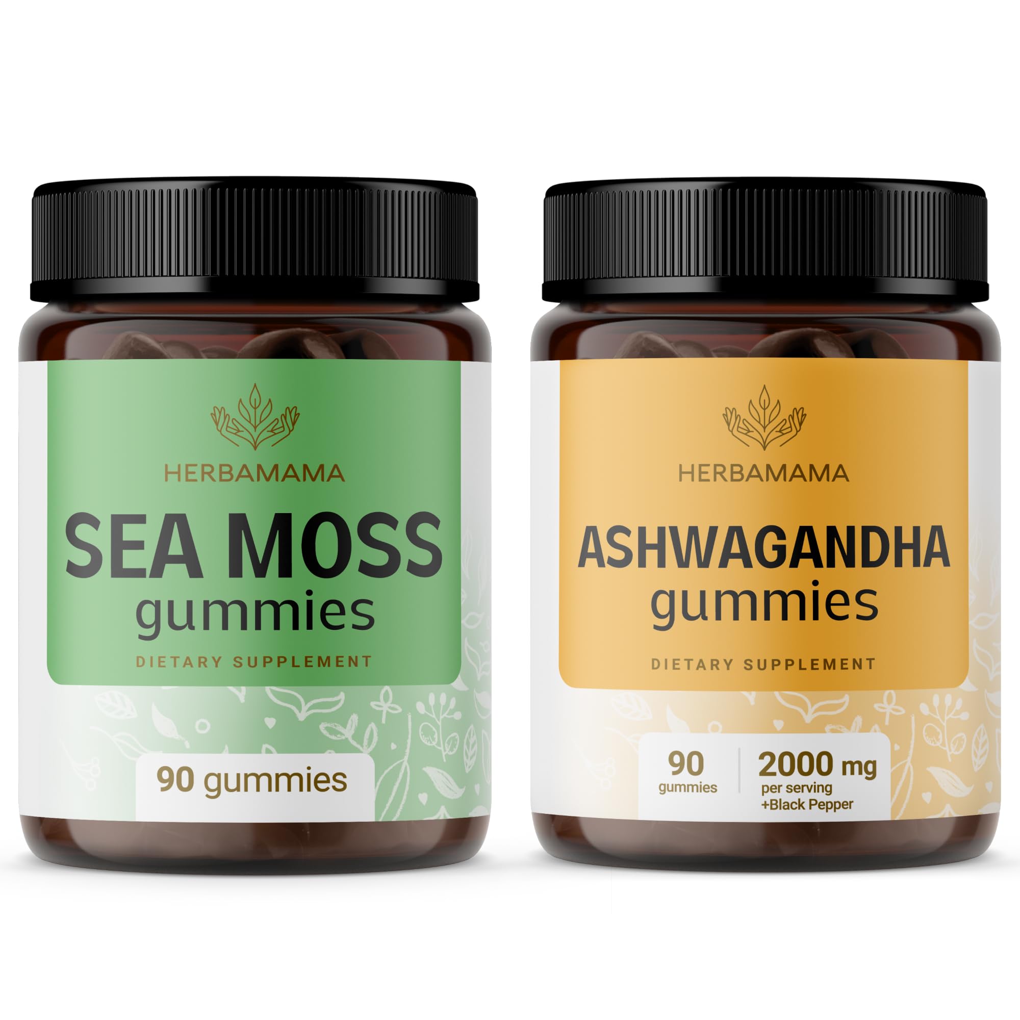 HERBAMAMA Sea Moss and Ashwagandha Kit - Bundle of 1600 mg Sea Moss with Bladderwrack & Ashwagandha Root Gummies - Vegan Non-GMO Gelatin-Free - 2 Pack