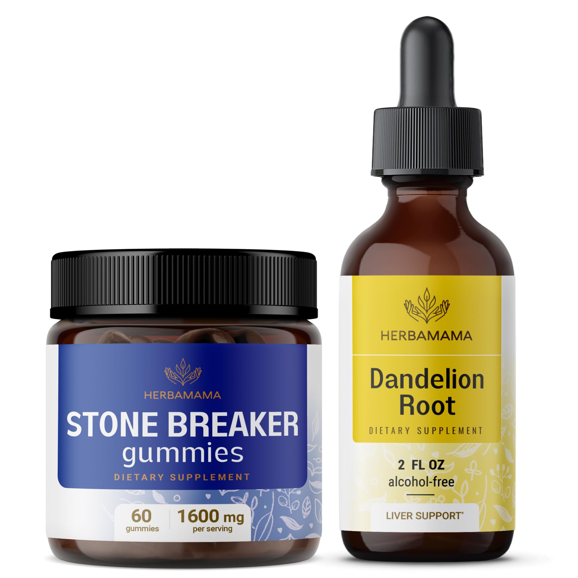 HERBAMAMA Stone Breaker and Dandelion Kit - Bundle of 1600mg Chanca Piedra Gummies & Dandelion Root Tincture 2 Fl Oz - Vegan Non-GMO Alcohol & Gelatin-Free - 2 Pack