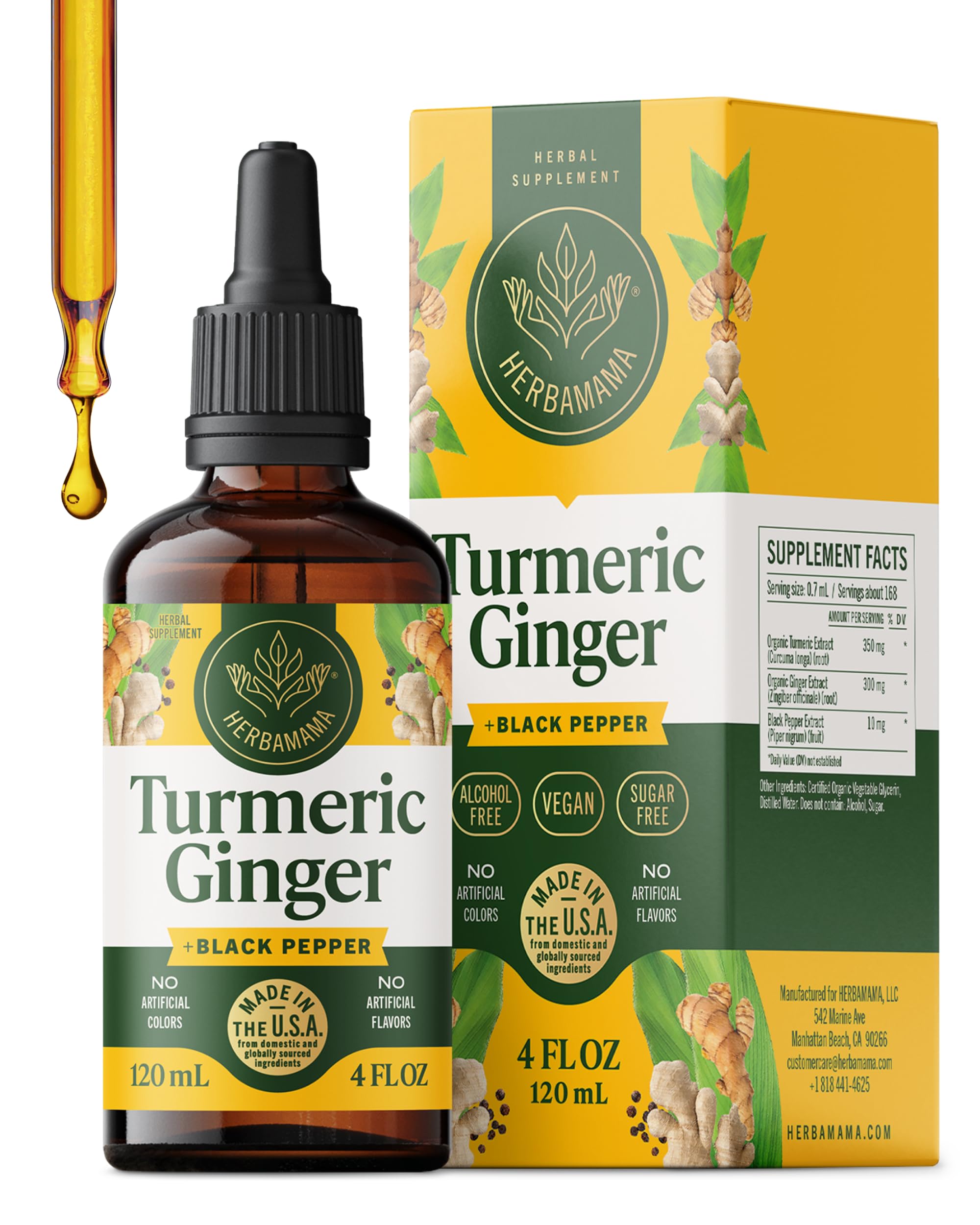 HERBAMAMA Turmeric and Ginger Supplement - Vegan Immune Complex with Liquid Turmeric with Ginger and Black Pepper Extract - Non-GMO, Alcohol & Sugar-Free Immunity Drops - 56-Day Supply 4 Fl Oz (Pack of 1)