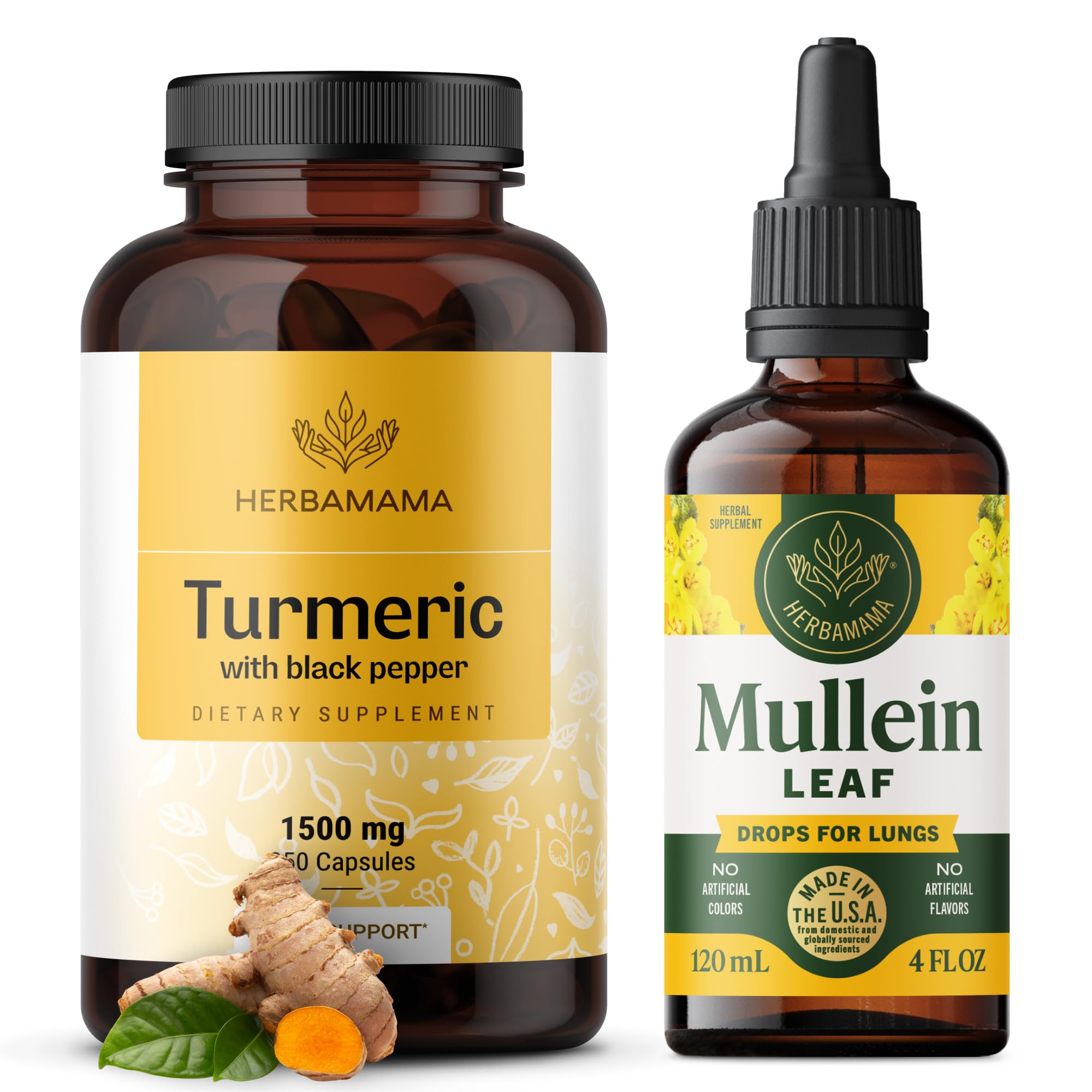 HERBAMAMA Turmeric and Mullein Leaf Kit - Bundle of 1500 mg Turmeric Curcumin Capsules & Mullein Leaf Extract Tincture - Vegan Non GMO Sugar & Alcohol-Free - 2 Pack