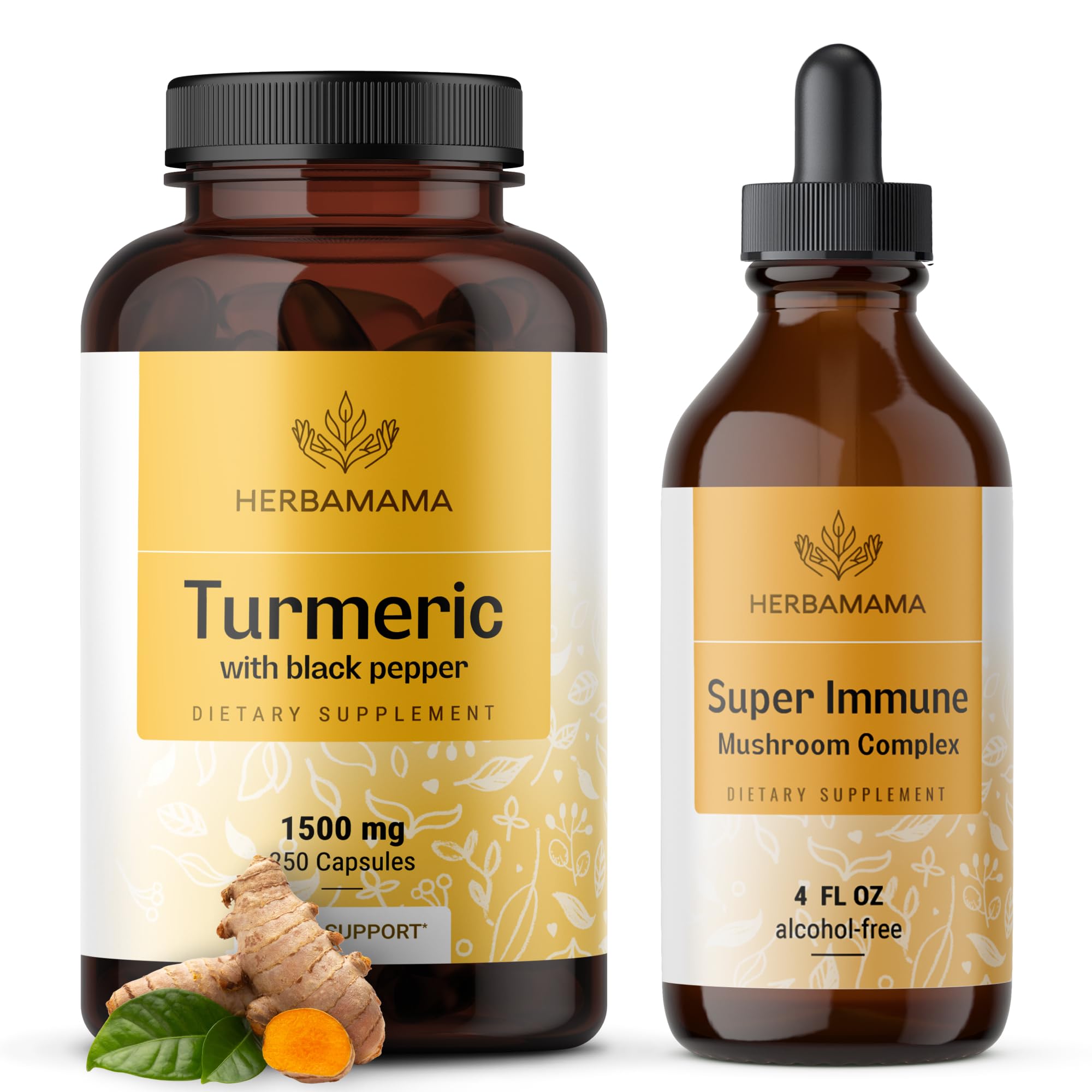 Support both your overall well-being and immunity with the powerful combination of Herbamama Turmeric Capsules with Black Pepper and Herbamama Multi-Mushroom Immune Support Tincture. Herbamama Turmeric Capsules with Black Pepper, crafted from the roots of Curcuma longa, are designed to support overall care. These vegan, non-GMO capsules contain a blend of turmeric root and black pepper extract, making them an essential addition to your daily antioxidant support routine. With a 125-day supply, the easy-to-swallow capsules fit seamlessly into your daily life, offering consistent support whether you're at home or on the go. Complementing this, Herbamama Multi-Mushroom Immune Support Tincture features a blend of eight mushrooms, including lion's mane, reishi, and chaga, to help support immune health. This vegan, non-GMO liquid tincture is free from alcohol and artificial additives, providing a pure plant-based formula that ensures up to 98 absorption. With a 56-day supply, simply shake well and take the tincture by adding one squeeze to your drink or directly under your tongue, three times daily. Together, these two supplements offer a comprehensive approach to both antioxidant support and immune well-being, making them ideal additions to your daily wellness routine.For a Variety of Lifestyles: Our herbal supplements are gluten-free, non-GMO, free from artificial colors, and any other fillers. Herbamama pure Turmeric capsules with black pepper are crafted to complement any lifestyle. Clean Mushroom Mix: Herbamama mushroom extract liquid supplement features a simple formula - lion's mane, agaricus, chaga, cordyceps, maitake, reishi, shiitake, and turkey tail. Made vegetarian, with an easy-to-digest formula and no artificial additives. Only Three Ingredients: Our antioxidant supplement features a simple formula with just three ingredients - Curcuma longa, dried black pepper, and a vegetable cellulose capsule. Made vegetarian, with an easy-to-digest formula with no artificial additives. Mushroom Immune Support: Each drop of Herbamama's mushroom complex liquid drops is crafted to support immune health. Our vegan eight-mushroom blend supplements provide immune support, ensuring overall well-being. Antioxidant Support: Herbamama's Turmeric curcumin with black pepper capsules are crafted for herbal care. This plant-based blend can help with antioxadants, ensuring overall well-being.