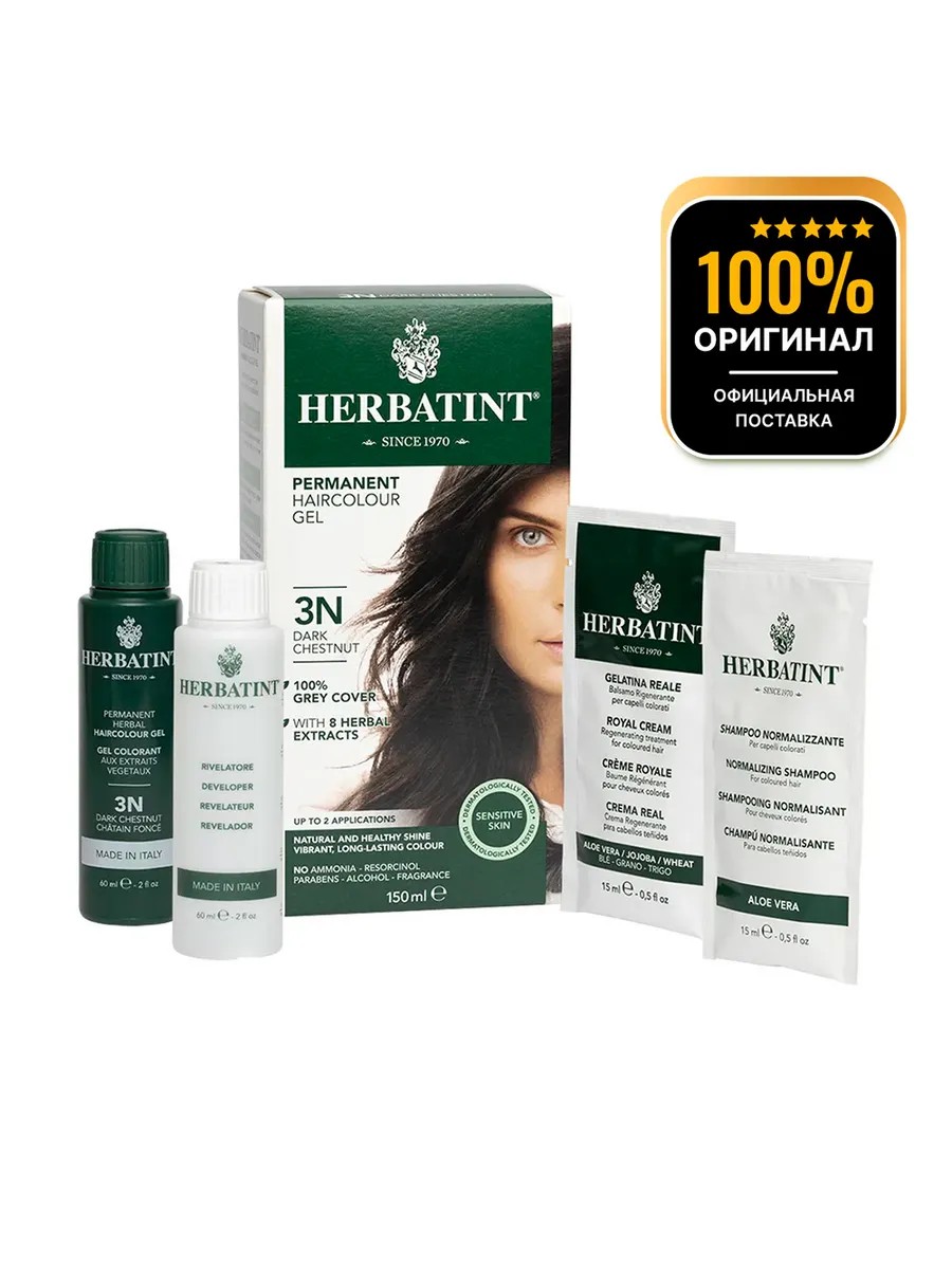 Гель-краска Гербатинт Тон 3N темный каштан, сочный натуральный оттенок. Безопасная и стойкая безаммиачная гель-краска для волос, обогащенная экстрактами органических растений для всестороннего ухода за кожей головы и волосами в процессе окрашивания. Обеспечивает 100% покрытие седины, мягкое изменение природного цвета и великолепный естественный результат, богатый сияющими переливами цвета. Улучшает качество волос, придавая им плотность, упругость и жизненную силу. Алоэ вера, гамамелис, эхинацея и березовый лист смягчают и увлажняют кожу головы, снижая риск раздражения. Скорлупа грецкого ореха и корень ревеня способствуют более длительному и яркому окрашиванию. Кора хинного дерева активизирует рост волос, а масло лимнантеса ухаживает за волосами по всей длине, предотвращая излишнюю сухость. Деликатная веганская формула не раздражает даже самую чувствительную кожу головы, что подтверждают результаты дерматологического тестирования. Идеальный результат окрашивания всего за 40 минут. Без запаха.