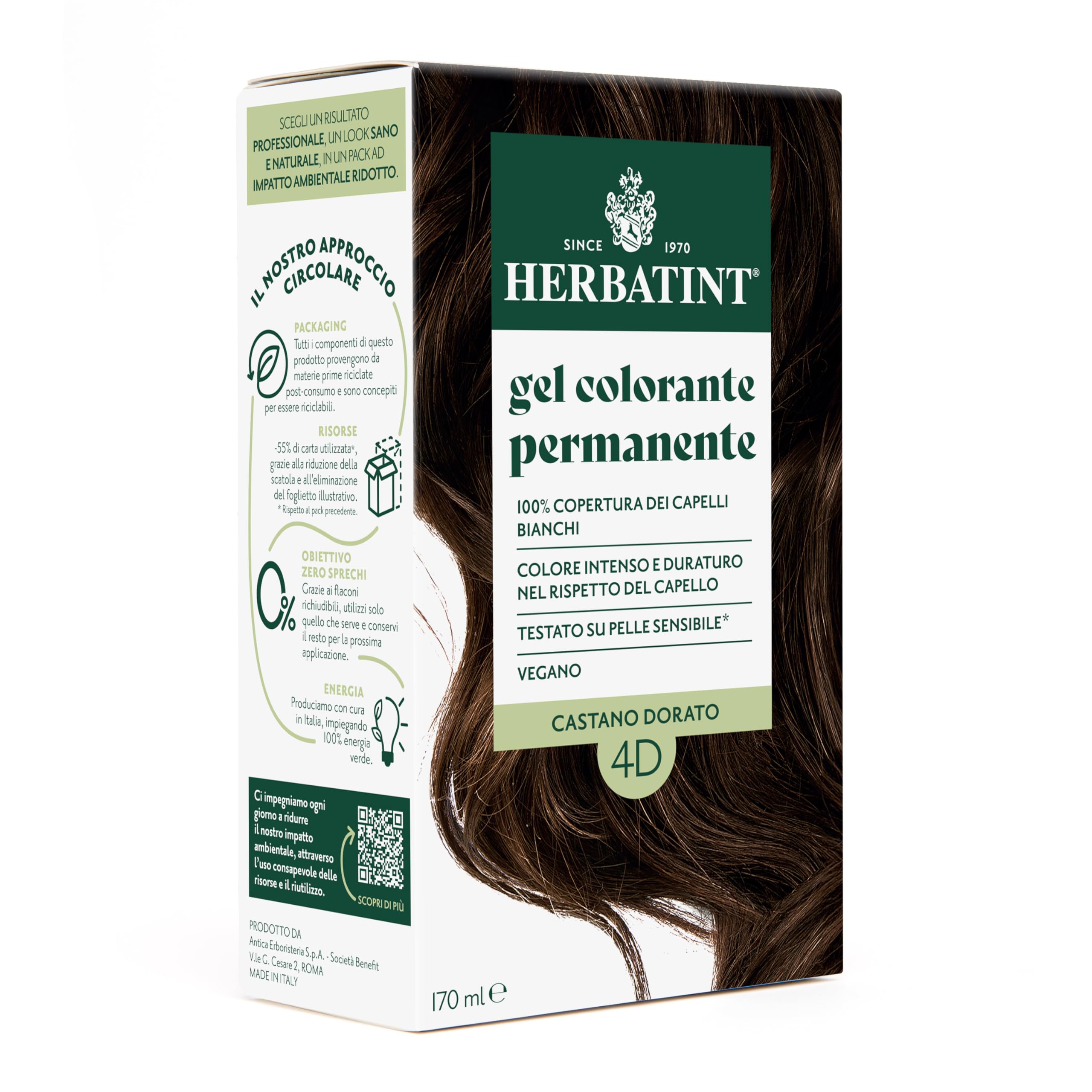 Herbatint 4D Permanent Hair Color Gel Golden Brown 170ml Ammonia-free permanent hair color that covers 100 of gray hair. The formula is enriched with eight organic plant extracts to nourish and protect hair and skin, preserve color intensity, and deliver a natural, long-lasting result. Dermatologically tested on sensitive skin, it offers excellent skin compatibility. Find your perfect shade by choosing a single color or mixing several shades together to create your unique, natural look. The resealable bottles allow you to store unmixed product for future applications. The new 170ml size maintains the exclusive Herbatint formula in a more compact package made from recycled and recyclable raw materials. It also includes a 50ml bottle of Herbatint Royal Conditioner. The 170ml pack contains: 1 bottle of Herbatint hair dye (60ml), 1 bottle of color detector (60ml), 1 bottle of Herbatint Royal Conditioner (50ml), and a pair of gloves. Instructions are printed inside the box. INGREDIENTS 4D Golden Brown Laureth-4, Propylene glycol, Aqua (Water), PEG-2 Oleamine, Ethanolamine, Oleic acid, p-Phenylenediamine, Aloe Barbadensis (Aloe Vera) Leaf Juice , Hamamelis Virginiana (Witch Hazel) leaf extract , Betula Alba (Birch) leaf extract , Echinacea. Acea angustifore lia (Echinacea) root extract , Juglans regia (Walnut) leaf extract , Rheum officinale stem extract , Cinchona calisaya (Cinchona) bark extract, Limnanthes alba (Meadowfoam) seed oil, 2-Methylresorcinol, 4-Chlororesorcinol, p-Methylaminophenol sulfate, Tetrasodium glutamate diaceate, 2-Amino-3-Hydroxypyridine, Cetrimonium chloride, Sodium metabisulfite, Glycerin. Derived from natural origin ingredients. Ingredients from organic farming. INSTRUCTIONS FOR USE Prepare the eye for your color: • A brush. • A bowl, plastic or glass. • A protective cape or an old hairdryer. • A measuring cup (recommended). Prepare your hair: It is recommended not to wash your hair 24 hours before coloring, as the natural oils produced by the skin provide a natural protective barrier. It is important to ensure your hair is free of any styling products (leave-in treatments, conditioner). 1. Prepare your permanent gel: Wear gloves and protect your clothing with a cape or towel. Mix equal parts of the two bottles, color and developer, in a bowl. Depending on the length, thickness, and porosity of your hair, you may need more or less product. The important thing is to maintain a 1:1 mixing ratio of color to developer. Recommended color dosages: Regrowth up to 2 cm ? 30 ml color 30 ml color corrector Short hair ? 40 ml color 40 ml color corrector Long hair ? 60 ml color 60 ml color corrector After use, carefully close the bottles to preserve any unused product for the next application. Remember that any product already mixed and remaining in the bowl cannot be stored. 2. Application: Apply your color to dry hair. Divide your hair into four equal sections (vertically, from forehead to nape of the neck, and horizontally, from ear to ear). To avoid staining, before starting the application, spread a moisturizing cream along your hairline. Apply the gel with a brush, starting at the roots. 3. Rinse and complete the treatment. After 40 minutes, thoroughly wash your hair, tilting your head back to avoid contact with the eyes. Apply your usual shampoo or Color Safe Shampoo and rinse until the water runs completely clear. Apply Royal Conditioner, the acidic pH balm that restructures the hair by sealing in the color and preserving its shine. Leave it on for 1 minute, then rinse and dry. Have fun customizing your color! You can create a natural-looking, reflective color by mixing two or more shades. The only rule is a 1:1 mixing ratio. This means that the total ml of color obtained (bottle 1 of the chosen shades) must be the same as the amount of developer (bottle 2). Example: My color is 6N and I want to add a golden sheen to my color. Mix 30 ml of color 6N 30 ml of color 7D (bottle 1) with 60 ml of detector (bottle 2). SAFETY WARNING Hair dyes can cause severe allergic reactions. Please read and follow the instructions. It is recommended to perform a patch test 48 hours before application. This product is not intended for use on persons under the age of 16. Temporary black henna tattoos may increase the risk of allergy. Do not dye hair: • If you have a rash on your face or if your scalp is sensitive, irritated, or damaged, • If you have experienced any reactions after dyeing your hair, • If you have experienced any reactions after a temporary black henna tattoo. Do not use to dye eyelashes or eyebrows. Wear suitable gloves. Avoid contact with eyes. Rinse eyes immediately if product comes into contact with them. Contains diammonium benzene and hydrogen peroxide. Mixing ratio 1:1 See moreExclusive, gentle formula: permanent hair color free from ammonia, parabens, resorcinol, alcohol, and fragrance nickel tested, gluten-free, cruelty-free, and vegan. A low concentration of hydrogen peroxide (10 volume - 3 ) allows for lightening of natural hair color up to a maximum of 2 shades. Reusable and easy to apply: Herbatint hair color is odorless and, thanks to its gel texture, won't drip, ensuring precise and even distribution from roots to tips. Unmixed product can be stored for future applications in the resealable bottles. Customizable color: Herbatint permanent hair color allows you to mix 2 or more shades to achieve a unique color result, just like in professional salons. Easily add golden, copper, or other tones, maintaining a 1:1 mixing ratio between color and detector. High performance and tolerance: Herbatint hair color provides 100 gray coverage. Its delicate formula, dermatologically tested on sensitive skin, is enriched with 8 organic plant extracts to nourish and protect both hair and scalp during coloring. New 170ml size: same formula, new packaging, more product! Herbatint 170ml permanent hair color retains its exclusive formula and comes in more compact packa