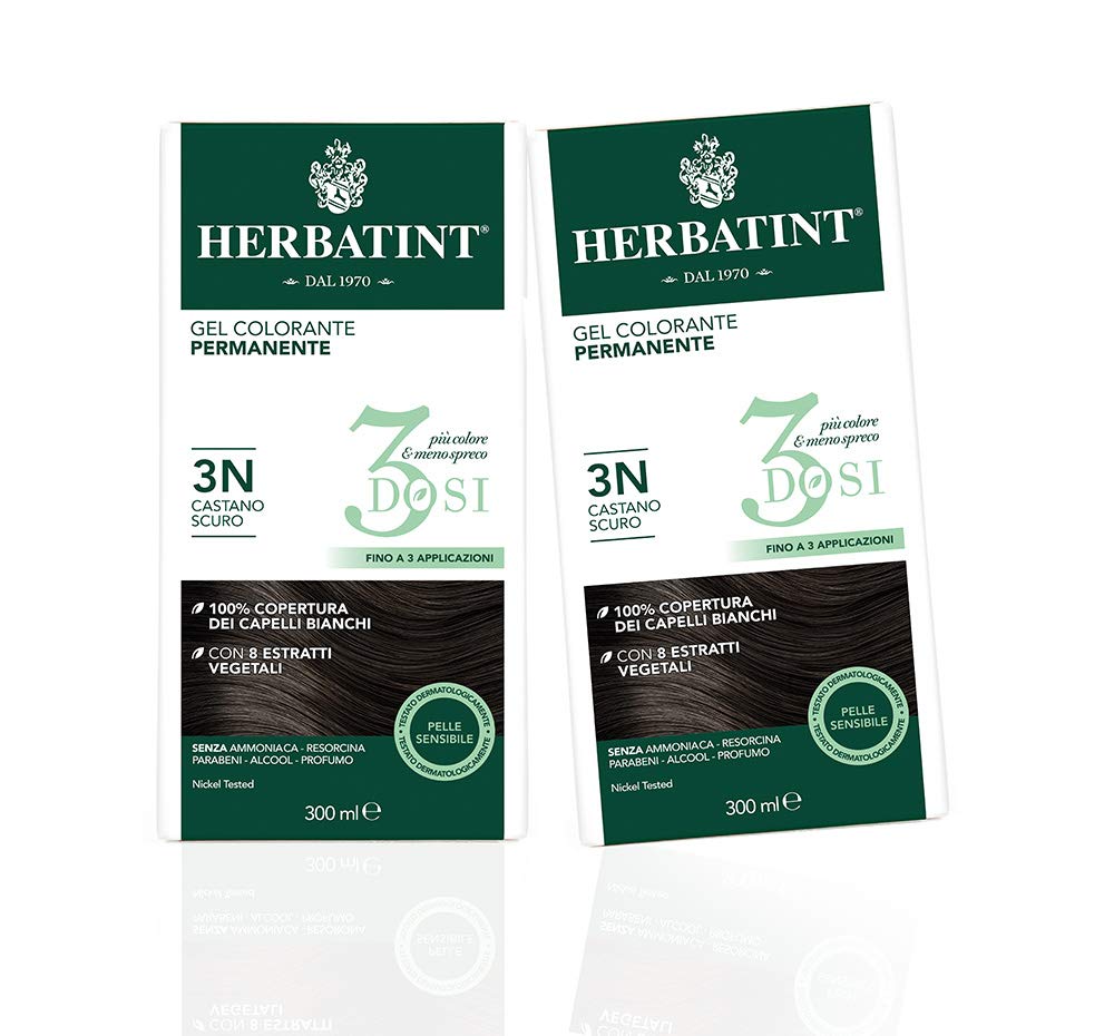 Herbatint is a permanent, ammonia-free gel hair color enriched with 8 certified organic plant extracts. It provides 100 gray coverage for an intense, natural, and long-lasting result with rich highlights. Its gentle formula is free of ammonia, resorcinol, parabens, alcohol, and fragrance, and is dermatologically tested on sensitive skin. Herbatint is gluten-free, nickel-tested, and suitable for vegans. Available in over 30 shades, it is easy to mix and apply thanks to its odorless gel texture. Achieve perfect color in just 40 minutes. Herbatint's gentle formula, with a low concentration of hydrogen peroxide (10 volume), lightens natural hair color by up to 2 shades. Herbatint is packaged in fully recyclable FSC-certified cardboard, and its packaging is multi-purpose thanks to the resealable bottles. Herbatint 3Doses further highlights the product's versatility, allowing for multiple applications with a single package, thus reducing environmental impact. The resealable bottles allow for precise dispensing and mixing of the necessary amount of color and toner, and for storing any excess product for future applications, preventing unnecessary waste. INSTRUCTIONS FOR USE Mix equal parts color and toner. Apply the gel to dry, unwashed hair, starting at the roots and working towards the ends. Leave on for the time indicated on the packaging. Rinse thoroughly.The delicate formula with a low concentration of hydrogen peroxide (10 volumes - 3 ) allows you to lighten your natural color by up to two shades. The 120ml color and detector bottles each allow for multiple applications: any unused, unmixed product can be stored thanks to the perfectly resealable bottles. Easy to apply thanks to its gel texture, Herbatint's odorless formula won't drip and ensures precise, even color distribution throughout your hair, from roots to tips. It's free of ammonia, parabens, resorcinol, alcohol, and perfume, as well as nickel, gluten, cruelty-free, and vegan. The gentle formula, dermatologically tested on sensitive skin, is enriched with eight organic plant extracts to nourish and protect hair and skin during the coloring process.Herbatint Gel Colorant Permanent 3Doses 3N Châtain Foncé - 2 Boîtes (2 x 300 ml)DESCRIPTION DU PRODUIT DESCRIPTION DU PRODUIT Herbatint est une coloration permanente en gel sans ammoniaque, enrichie en 8 extraits végétaux certifiés bio, couvrant 100 de cheveux blancs pour un résultat intense naturel et durable, riche en reflets. Sa formule délicate ne contient pas d'ammoniaque, de résorcine, de parabènes, d'alcool ou de parfum et est testée dermatologiquement sur la peau sensible. Herbatint est sans gluten, testé au nickel et convient pour les végétaliens. Disponible en plus de 30 teintes de couleur, il est facile à mélanger et à appliquer grâce à sa texture de gel inodore. Un résultat de couleur parfait en seulement 40 minutes. La formule délicate d'Herbatint avec une faible concentration de peroxyde d'hydrogène (10 volumes) permet d'éclaircir la couleur naturelle jusqu'à un maximum de 2 tons. Herbatint est emballé dans du carton FSC entièrement recyclable et son emballage et multi-usages grâce aux flacons parfaitement refermables. Le Herbatint 3Doses souligne encore plus la caractéristique polyvalente du produit, permettant d'effectuer de multiples applications avec un seul emballage réduisant ainsi l'impact environnemental. Les flacons parfaitement refermables permettent en effet de doser et de mélanger la quantité de couleur et de détecteur nécessaire à l'utilisation et de conserver le produit en excès pour les applications ultérieures, évitant ainsi les gaspillages inutiles. MODE D'EMPLOI Mélanger la couleur et le détecteur à parts égales. Appliquer le gel sur cheveux secs non lavés, en commençant par les racines en procédant vers les pointes. Laisser agir pendant le temps indiqué sur l'emballage. Rincer abondamment.La formule délicate et à faible concentration de peroxyde d'hydrogène (10 volumes - 3 ), permet d'éclaircir la couleur naturelle jusqu'à un maximum de 2 tons. Les flacons de couleur et détecteur de 120 ml permettent chacun de multiples applications : le produit non utilisé et non mélangé peut être conservé grâce aux flacons parfaitement refermables. Facile à appliquer grâce à sa texture gel, la formule inodore d'Herbatint ne coule pas et permet une répartition précise et uniforme de la couleur sur toute la chevelure, des racines aux pointes. Sans ammoniaque, parabène, resorcine, alcool et parfum, sans nickel, sans gluten, sans cruauté et végétalien. Formule douce, testée dermatologiquement sur peau sensible, enrichie de 8 extraits végétaux bio, pour nourrir et protéger les cheveux et la peau pendant la coloration.