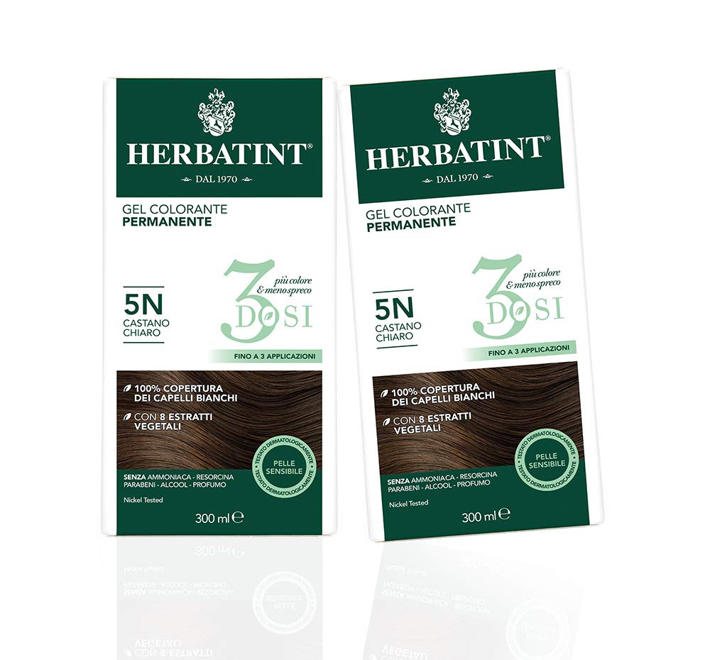 Herbatint is a permanent, ammonia-free gel hair color enriched with 8 certified organic plant extracts. It provides 100 gray coverage for an intense, natural, and long-lasting result with rich highlights. Its gentle formula is free of ammonia, resorcinol, parabens, alcohol, and fragrance, and is dermatologically tested on sensitive skin. Herbatint is gluten-free, nickel-tested, and suitable for vegans. Available in over 30 shades, it is easy to mix and apply thanks to its odorless gel texture. Achieve perfect color in just 40 minutes. Herbatint's gentle formula, with a low concentration of hydrogen peroxide (10 volume), lightens natural hair color by up to 2 shades. Herbatint is packaged in fully recyclable FSC-certified cardboard, and its packaging is multi-purpose thanks to the resealable bottles. Herbatint 3Doses further highlights the product's versatility, allowing for multiple applications with a single package and thus reducing environmental impact. The resealable bottles allow for precise dispensing and mixing of the precise amount of color and toner needed for each application, and for storing any excess product for future use, preventing unnecessary waste. INSTRUCTIONS FOR USE Mix equal parts color and toner and apply to dry, unwashed hair.The delicate formula with a low concentration of hydrogen peroxide (10 volumes - 3 ) allows you to lighten your natural color by up to two shades. The 120ml color and detector bottles each allow for multiple applications: any unused, unmixed product can be stored thanks to the perfectly resealable bottles. Easy to apply thanks to its gel texture, Herbatint's odorless formula won't drip and ensures precise, even color distribution throughout your hair, from roots to tips. It's free of ammonia, parabens, resorcinol, alcohol, and perfume, as well as nickel, gluten, cruelty-free, and vegan. The gentle formula, dermatologically tested on sensitive skin, is enriched with eight organic plant extracts to nourish and protect hair and skin during the coloring process.Herbatint Gel Colorant Permanent 3Doses 5N, Châtain Clair, 2 x 300 MlDESCRIPTION DU PRODUIT DESCRIPTION DU PRODUIT Herbatint est une coloration permanente en gel sans ammoniaque, enrichie en 8 extraits végétaux certifiés bio, couvrant 100 de cheveux blancs pour un résultat intense naturel et durable, riche en reflets. Sa formule délicate ne contient pas d'ammoniaque, de résorcine, de parabènes, d'alcool ou de parfum et est testée dermatologiquement sur la peau sensible. Herbatint est sans gluten, testé au nickel et convient pour les végétaliens. Disponible en plus de 30 teintes de couleur, il est facile à mélanger et à appliquer grâce à sa texture de gel inodore. Un résultat de couleur parfait en seulement 40 minutes. La formule délicate d'Herbatint avec une faible concentration de peroxyde d'hydrogène (10 volumes) permet d'éclaircir la couleur naturelle jusqu'à un maximum de 2 tons. Herbatint est emballé dans du carton FSC entièrement recyclable et son emballage et multi-usages grâce aux flacons parfaitement refermables. Le Herbatint 3Doses souligne encore plus la caractéristique polyvalente du produit, permettant d'effectuer de multiples applications avec un seul emballage réduisant ainsi l'impact environnemental. Les flacons parfaitement refermables permettent en effet de doser et de mélanger la quantité de couleur et de détecteur nécessaire à l'utilisation et de conserver le produit en excès pour les applications ultérieures, évitant ainsi les gaspillages inutiles. MODE D'EMPLOI Mélanger la couleur et le détecteur à parts égales et appliquer sur cheveux secs et non lavés.La formule délicate et à faible concentration de peroxyde d'hydrogène (10 volumes - 3 ), permet d'éclaircir la couleur naturelle jusqu'à un maximum de 2 tons. Les flacons de couleur et détecteur de 120 ml permettent chacun de multiples applications : le produit non utilisé et non mélangé peut être conservé grâce aux flacons parfaitement refermables. Facile à appliquer grâce à sa texture gel, la formule inodore d'Herbatint ne coule pas et permet une répartition précise et uniforme de la couleur sur toute la chevelure, des racines aux pointes. Sans ammoniaque, parabène, resorcine, alcool et parfum, sans nickel, sans gluten, sans cruauté et végétalien. Formule douce, testée dermatologiquement sur peau sensible, enrichie de 8 extraits végétaux bio, pour nourrir et protéger les cheveux et la peau pendant la coloration.