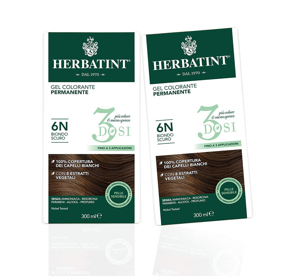 Herbatint is a permanent, ammonia-free gel hair color enriched with 8 certified organic plant extracts. It provides 100 gray coverage for an intense, natural, and long-lasting result with rich highlights. Its gentle formula is free of ammonia, resorcinol, parabens, alcohol, and fragrance, and is dermatologically tested on sensitive skin. Herbatint is gluten-free, nickel-tested, and suitable for vegans. Available in over 30 shades, it is easy to mix and apply thanks to its odorless gel texture. Achieve perfect color in just 40 minutes. Herbatint's gentle formula, with a low concentration of hydrogen peroxide (10 volume), lightens natural hair color by up to 2 shades. Herbatint is packaged in fully recyclable FSC-certified cardboard, and its packaging is multi-purpose thanks to the resealable bottles. Herbatint 3Doses further highlights the product's versatility, allowing for multiple applications with a single package and thus reducing environmental impact. The perfectly resealable bottles allow for precise dispensing and mixing of the exact amount of color and toner needed for each application, and for storing any excess product for future use, preventing unnecessary waste. INSTRUCTIONS FOR USE Mix equal parts color and toner and apply the gel to dry, unwashed hair.The delicate formula with a low concentration of hydrogen peroxide (10 volumes - 3 ) allows you to lighten your natural color by up to two shades. The 120ml color and detector bottles each allow for multiple applications: any unused, unmixed product can be stored thanks to the perfectly resealable bottles. Easy to apply thanks to its gel texture, Herbatint's odorless formula won't drip and ensures precise, even color distribution throughout your hair, from roots to tips. It's free of ammonia, parabens, resorcinol, alcohol, and perfume, as well as nickel, gluten, cruelty-free, and vegan. The gentle formula, dermatologically tested on sensitive skin, is enriched with eight organic plant extracts to nourish and protect hair and skin during the coloring process.Herbatint Gel Colorant Permanent 3Doses 6N Blond Foncé - 2 Boîtes (2 x 300 ml)DESCRIPTION DU PRODUIT DESCRIPTION DU PRODUIT Herbatint est une coloration permanente en gel sans ammoniaque, enrichie en 8 extraits végétaux certifiés bio, couvrant 100 de cheveux blancs pour un résultat intense naturel et durable, riche en reflets. Sa formule délicate ne contient pas d'ammoniaque, de résorcine, de parabènes, d'alcool ou de parfum et est testée dermatologiquement sur la peau sensible. Herbatint est sans gluten, testé au nickel et convient pour les végétaliens. Disponible en plus de 30 teintes de couleur, il est facile à mélanger et à appliquer grâce à sa texture de gel inodore. Un résultat de couleur parfait en seulement 40 minutes. La formule délicate d'Herbatint avec une faible concentration de peroxyde d'hydrogène (10 volumes) permet d'éclaircir la couleur naturelle jusqu'à un maximum de 2 tons. Herbatint est emballé dans du carton FSC entièrement recyclable et son emballage et multi-usages grâce aux flacons parfaitement refermables. Le Herbatint 3Doses souligne encore plus la caractéristique polyvalente du produit, permettant d'effectuer de multiples applications avec un seul emballage réduisant ainsi l'impact environnemental. Les flacons parfaitement refermables permettent en effet de doser et de mélanger la quantité de couleur et de détecteur nécessaire à l'utilisation et de conserver le produit en excès pour les applications ultérieures, évitant ainsi les gaspillages inutiles. MODE D'EMPLOI Mélanger la couleur et le détecteur à parts égales et appliquer le gel sur cheveux secs et non lavésLa formule délicate et à faible concentration de peroxyde d'hydrogène (10 volumes - 3 ), permet d'éclaircir la couleur naturelle jusqu'à un maximum de 2 tons. Les flacons de couleur et détecteur de 120 ml permettent chacun de multiples applications : le produit non utilisé et non mélangé peut être conservé grâce aux flacons parfaitement refermables. Facile à appliquer grâce à sa texture gel, la formule inodore d'Herbatint ne coule pas et permet une répartition précise et uniforme de la couleur sur toute la chevelure, des racines aux pointes. Sans ammoniaque, parabène, resorcine, alcool et parfum, sans nickel, sans gluten, sans cruauté et végétalien. Formule douce, testée dermatologiquement sur peau sensible, enrichie de 8 extraits végétaux bio, pour nourrir et protéger les cheveux et la peau pendant la coloration.