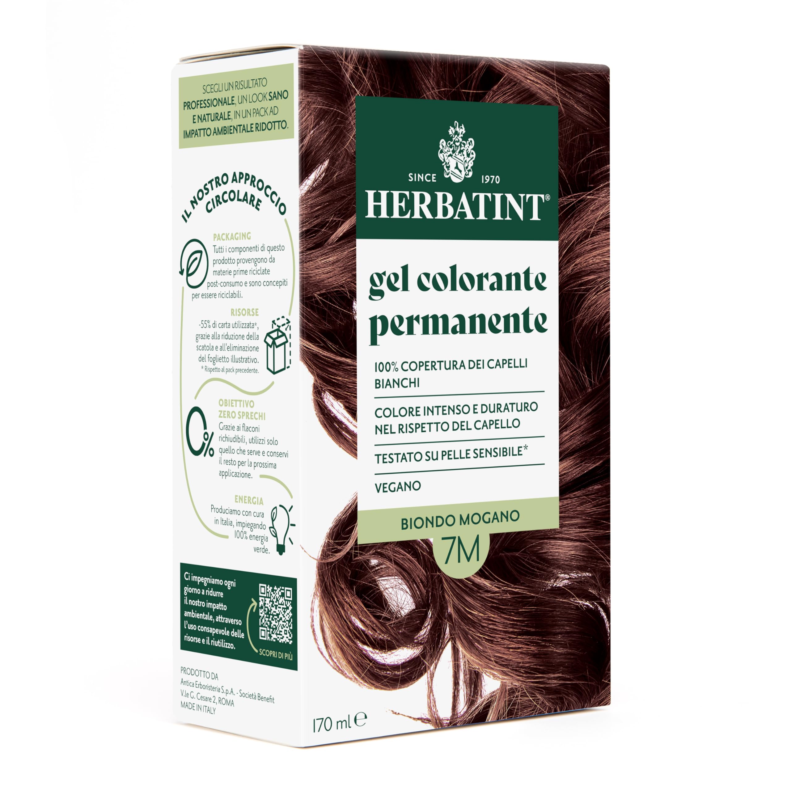 Herbatint Permanent Hair Color Gel 7M Mahogany Blonde 170ml Ammonia-free permanent hair color that covers 100 of gray hair. The formula is enriched with eight organic plant extracts to nourish and protect hair and skin, preserve color intensity, and deliver a natural, long-lasting result. Dermatologically tested on sensitive skin, it offers excellent skin compatibility. Find your perfect shade by choosing a single color or mixing several shades together to create your unique, natural look. The resealable bottles allow you to store unmixed product for future applications. The new 170ml size maintains the exclusive Herbatint formula in a more compact package made from recycled and recyclable raw materials. It also includes a 50ml bottle of Herbatint Royal Conditioner. The 170ml pack contains: 1 bottle of Herbatint colorant (60ml), 1 bottle of color detector (60ml), 1 bottle of Herbatint Royal Conditioner (50ml), and a pair of gloves. Instructions are printed directly inside the box. INGREDIENTS 7M Mahogany Blonde Laureth-4, Propylene glycol, Aqua (Water), PEG-2 Oleamine, Ethanolamine, Oleic Acid, Aloe Barbadensis (Aloe Vera) Leaf Juice , Hamamelis Virginiana (Witch Hazel) Leaf Extract , Birch Alba (Birch) Leaf Extract , Echinacea angustifolia (Echinacea (Echinacea (Echinacea (Echinacea) a) root extract. , Juglans regia (Walnut) leaf extract , Rheum officinale stem extract , Cinchona calisaya (Cinchona) bark extract, Limnanthes alba (Meadowfoam) seed oil, p-Phenylenediamine, p-Aminophenol, 2-Amino-3-hydroxypyridine, Tetrasodium Glutamate diacèate, m-Aminophenol, 2-methylresorcinol, 4-chlororesorcinol, Cetrimonium chloride, sodium metabisulfite, glycerin. Derived from natural origin ingredient. Ingredients from organic farming INSTRUCTIONS Prepare your eye for your color: • A brush. • A bowl, plastic or glass. • A protective cape or an old hairdryer. • A measuring cup (recommended). Prepare your hair: It is recommended not to wash your hair 24 hours before coloring, as the natural oils produced by the skin provide natural protection. It is important to have no traces of styling products (leave-in treatments, conditioner) on your hair. 1. Prepare your permanent gel: Wear gloves and protect your clothing with a cape or towel. Mix equal parts of the two bottles, color and developer, in a bowl. Depending on the length, thickness, and porosity of your hair, you may need You may need more or less product. The important thing is to maintain a 1:1 mixing ratio of color to detector. Recommended color dosages: Regrowth up to 2 cm ? 30 ml color 30 ml detector Short hair ? 40 ml color 40 ml detector Long hair ? 60 ml color 60 ml detector After use, carefully close the bottles to preserve any unused product for the next application. Remember that any product already mixed and remaining in the bowl cannot be stored. 2. Application: Apply your color to dry hair. Divide your hair into four equal sections (vertically, from forehead to nape of the neck, and horizontally, from ear to ear). To avoid staining, before starting the application, spread a moisturizing cream along your hairline. Apply Apply the gel with a brush, starting at the roots. 3. Rinse and complete the treatment. After 40 minutes, thoroughly wash your hair, tilting your head back to avoid contact with the eyes. Apply your usual shampoo or Color Safe Shampoo and rinse until the water runs completely clear. Apply Royal Conditioner, the acidic pH balm that restructures the hair by sealing in the color and preserving its shine. Leave it on for 1 minute, then rinse and dry. Have fun customizing your color! You can create a natural-looking, reflective color by mixing two or more shades. The only rule is a 1:1 mixing ratio. This means that the total ml of color obtained (bottle 1 of the chosen shades) must be the same as the amount of developer (bottle 2). Example: My color is 6N and I want to give it a golden sheen. Color. Mix 30 ml of color 6N 30 ml of color 7D (bottle 1) with 60 ml of detector (bottle 2). SAFETY WARNING Hair dyes can cause severe allergic reactions. Please read and follow the instructions. It is recommended to perform a patch test 48 hours before application. This product is not intended for use on persons under the age of 16. Temporary black henna tattoos may increase the risk of allergy. Do not dye hair: • If you have a rash on your face or if your scalp is sensitive, irritated, or damaged, • If you have experienced any reactions after dyeing your hair, • If you have experienced any reactions after a temporary black henna tattoo. Do not use to dye eyelashes or eyebrows. Wear suitable gloves. Avoid contact with eyes. Rinse eyes immediately if contact occurs. Contact with the product. Contains diammonium benzene and hydrogen peroxide. Mixing ratio 1:1 See moreExclusive, gentle formula: permanent hair color free from ammonia, parabens, resorcinol, alcohol, and fragrance nickel tested, gluten-free, cruelty-free, and vegan. A low concentration of hydrogen peroxide (10 volume - 3 ) allows for lightening of natural hair color up to a maximum of 2 shades. Reusable and easy to apply: Herbatint hair color is odorless and, thanks to its gel texture, won't drip, ensuring precise and even distribution from roots to tips. Unmixed product can be stored for future applications in the resealable bottles. Customizable color: Herbatint permanent hair color allows you to mix 2 or more shades to achieve a unique color result, just like in professional salons. Easily add golden, copper, or other tones, maintaining a 1:1 mixing ratio between color and detector. High performance and tolerance: Herbatint hair color provides 100 gray coverage. Its delicate formula, dermatologically tested on sensitive skin, is enriched with 8 organic plant extracts to nourish and protect both hair and scalp during coloring. New 170ml size: same formula, new packaging, more product! Herbatint 170ml permanent hair color retains its exclusive formula and com