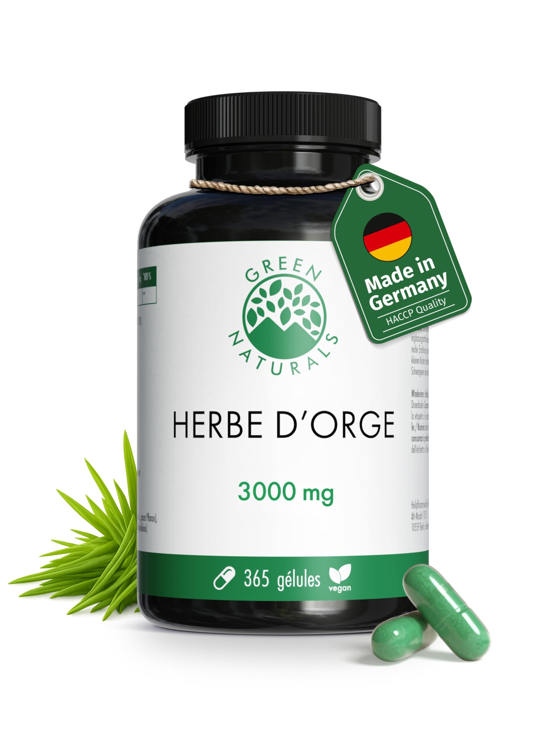 Herbe d'orge gélules naturelles et pures - Dosage élevé: 3.000 mg avec extrait 10:1-365 capsules (3 mois) - Qualité premium d'Allemagne - Végan et testé en laboratoire - Green Naturals