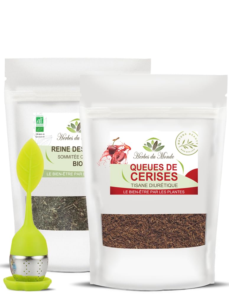 Herbes du Monde DUO Infusion Bien- tre : Queues de Cerises 100g & Reine des Pr s BIO 60g avec Infuseur | Plantes Infuser 100% Naturelles 2 Sachets + 1 Infuseur