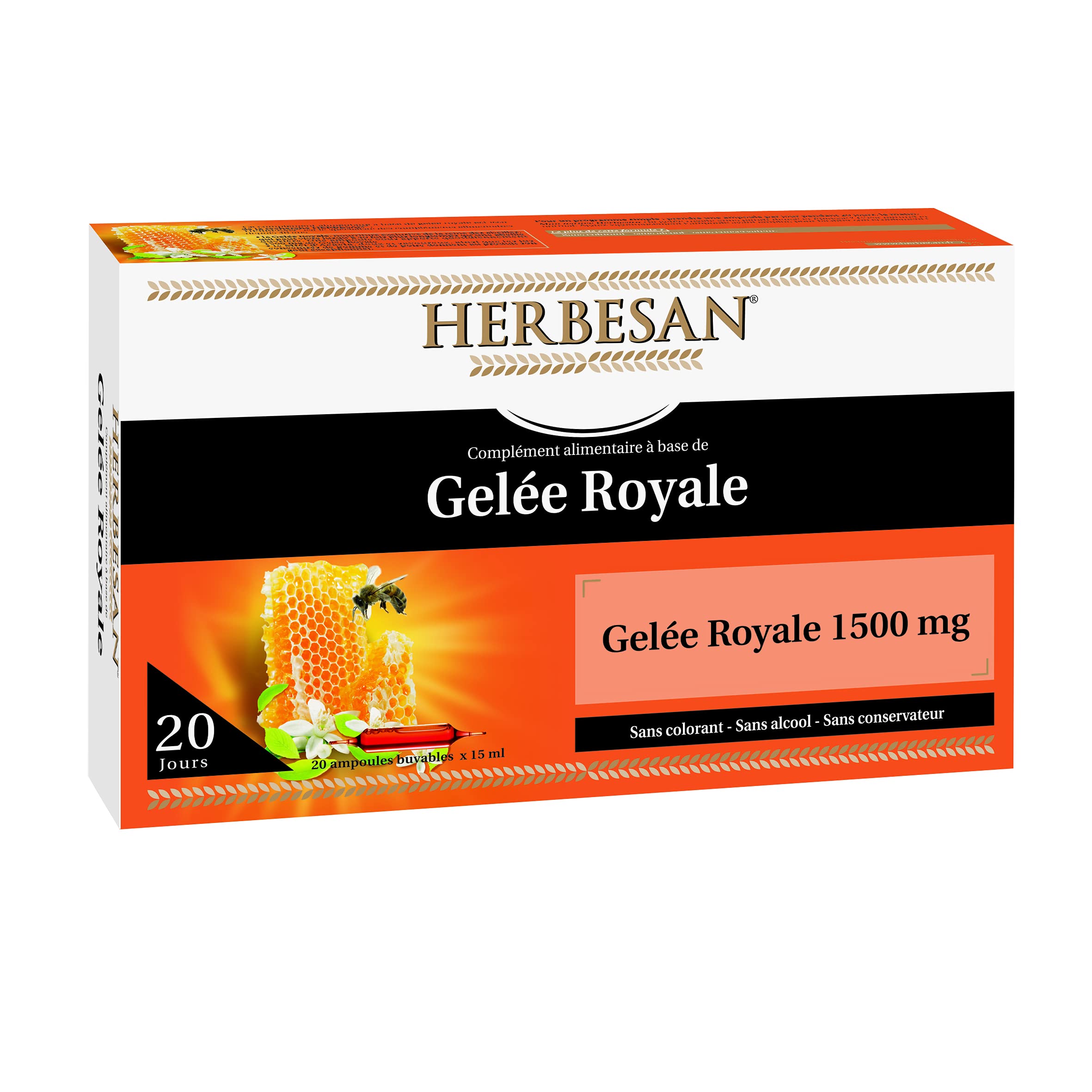 HERBESAN - ORGANIC ROYAL JELLY 1500MG - Royal Jelly, Honey, Pollen - Immune defenses - Made in France - 20 ampoules of 15ml?Purified water, ORGANIC Royal Jelly, concentrated ORGANIC Pear juice, ORGANIC Agave syrup, ORGANIC Honey, ORGANIC Pollen Ingredient from organic farming For 1 15ml ampoule: Royal Jelly 1500mg Honey: 250mg Pollen: 135 mg.1 ampoule per day. Shake the ampoule well before use. Do not use in children under 3 years of age. ? Not recommended in cases of asthma or allergies, particularly to bee products. Do not exceed the recommended portion to consume each day, ensure you have a varied and balanced diet and a healthy lifestyle. Keep out of reach of young children. Oral use only - not suitable for injection.?OUR EXPERTISE?For nearly 100 years, HERBESAN has been a French herbalist laboratory. Expert in phytotherapy, we develop and manufacture in our workshops in Hauts-de-France, natural effective products that meet all your needs. INGREDIENTS Purified water, ORGANIC Royal Jelly, concentrated ORGANIC Pear juice, ORGANIC Agave syrup, ORGANIC Honey, ORGANIC Pollen Ingredient from organic farming For 1 ampoule of 15ml: Royal Jelly 1500mg Honey: 250mg Pollen: 135 mg. DIRECTIONS FOR USE Take 1 ampoule per day. Shake the ampoule well before use. SAFETY WARNING Do not use in children under 3 years old. Not recommended in cases of asthma or allergies, particularly to bee products. Do not exceed the recommended portion to consume each day, ensure you have a varied and balanced diet and a healthy lifestyle. Keep out of reach of young children. Oral use only - not suitable for injection. OUR EXPERTISE?For nearly 100 years, HERBESAN has been a French herbalist laboratory. Experts in phytotherapy, we develop and manufacture natural and effective products in our workshops in Hauts-de-France that meet all your needs. DIRECTIONS FOR USE? Take 1 ampoule per day. Shake the ampoule vigorously before use. Do not use on infants. Not recommended for asthma or allergies, particularly to bee products. MADE IN FRANCE? We manufacture our products in our workshops in Hauts-de-France. Our formula is free of colorings, preservatives, and artificial flavors. They are suitable for vegetarian, gluten-free, and lactose-free diets. NATURALNESS QUALITY ?Using only ingredients of natural origin, our formula is free of colorings and preservatives. To preserve the quality of the raw materials, we exclusively process our product at low temperatures. IMMUNE DEFENSES ? A true treasure of the hive, Organic Royal Jelly combined with pollen supports the immune defenses, helps reduce fatigue and contributes to tone and energy. HERBESAN - GELÉE ROYALE 1500MG BIO - Gelée royale, Miel, Pollen - Défenses immunitaires - Fabrication française - 20 ampoules de 15ml?Eau purifiée, Gelée Royale BIO, jus concentré de Poire BIO, sirop d'Agave BIO, Miel BIO, Pollen BIO Ingrédient issu de l'agriculture biologique Pour 1 ampoule de 15ml : Gelée Royale 1500mg Miel : 250mg Pollen: 135 mg.1 ampoule par jour. Bien agiter l'ampoule avant l'emploi.Ne pas utiliser chez les enfants de moins de 3 ans.? Déconseillé en cas d'asthme ou d'allergies, notamment aux produits de la ruche. Ne pas dépasser la portion recommandée à consommer chaque jour, veiller à avoir une alimentation variée et équilibrée et un mode de vie sain. Tenir hors de la portée des jeunes enfants. Usage oral uniquement - ne convient pas en injection.?NOTRE EXPERTISE?Depuis près de 100 ans, HERBESAN est un laboratoire herboriste français. Expert en phytothérapie, nous développons et fabriquons dans nos ateliers des Hauts-de-France, des produits naturels efficaces qui répondent à tous vos besoins. INGRÉDIENTS Eau purifiée, Gelée Royale BIO, jus concentré de Poire BIO, sirop d'Agave BIO, Miel BIO, Pollen BIO Ingrédient issu de l'agriculture biologique Pour 1 ampoule de 15ml : Gelée Royale 1500mg Miel : 250mg Pollen: 135 mg. MODE D'EMPLOI Prendre 1 ampoule par jour. Bien agiter l'ampoule avant l'emploi. AVERTISSEMENT DE SÛRETÉ Ne pas utiliser chez les enfants de moins de 3 ans. Déconseillé en cas d'asthme ou d'allergies, notamment aux produits de la ruche. Ne pas dépasser la portion recommandée à consommer chaque jour, veiller à avoir une alimentation variée et équilibrée et un mode de vie sain. Tenir hors de la portée des jeunes enfants. Usage oral uniquement - ne convient pas en injection. NOTRE EXPERTISE?Depuis près de 100 ans, HERBESAN est un laboratoire herboriste français. Expert en phytothérapie, nous développons et fabriquons dans nos ateliers des Hauts-de-France, des produits naturels efficaces qui répondent à tous vos besoins. CONSEILS D'UTILISATION? Prendre 1 ampoule par jour. Agiter vigoureusement l'ampoule avant l'emploi.Ne pas utiliser chez les nourrissons. Déconseillé en cas d'asthme ou d'allergies, notamment aux produits de la ruche. FABRICATION FRANÇAISE? Nous fabriquons nos produits dans nos ateliers des Hauts-de-France. Notre formule est sans colorant, sans conservateur et sans arômes artificiel. Ils sont adaptés aux régimes végétariens, sans gluten, et sans lactose. NATURALITÉ QUALITÉ ?Uniquement à partir d'ingrédients d'origine naturelle, notre formule est sans colorant, sans conservateur. Pour préserver la qualité des matières premières, nous traitons exclusivement notre produit à basse température. DÉFENSES IMMUNITAIRES ? Véritable trésor de la ruche, la Gélée Royale Bio associée au pollen soutient les défenses immunitaires, aide à réduire la fatigue et contribue au tonus et à l'énergie.