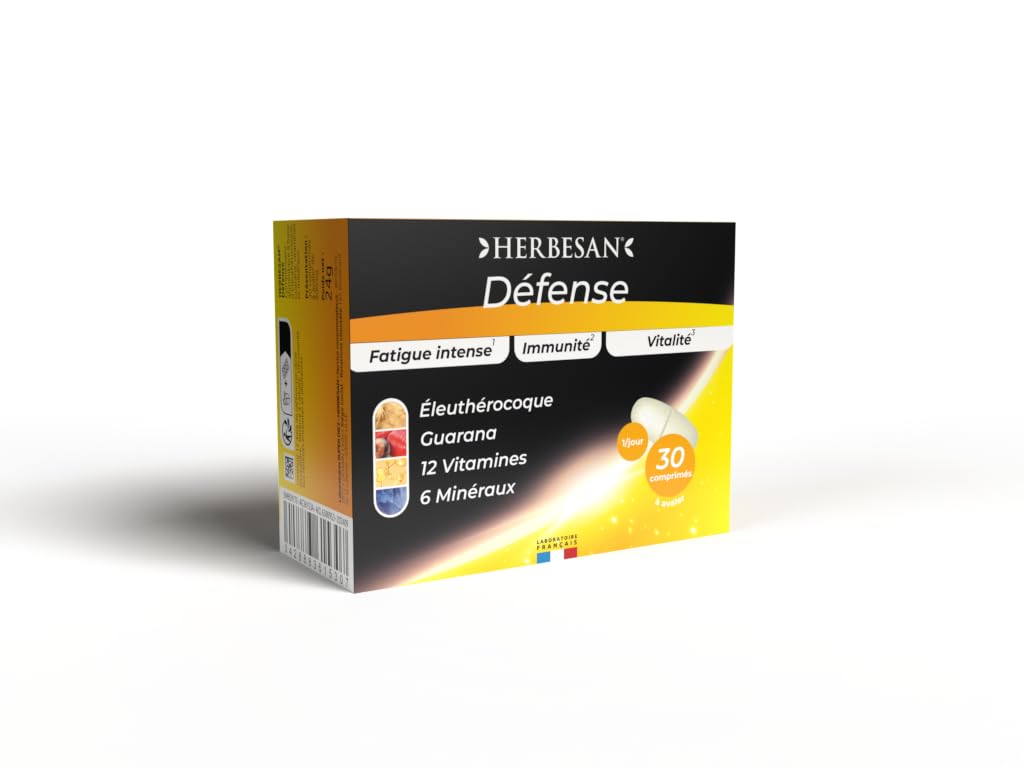 HERBESAN - DEFENSE COMPLEX - 20 active ingredients - Immunity booster - French manufacture - 30 tablets to swallow Bulking agent: Sorbitol - Guarana extract (seed) - Vitamin C - Eleutherococcus extract (root) - Vitamin B3 - Anti-caking agent: Magnesium stearate - Vitamins A, B1, B2, B5, B6, B8, B9, B12, D and E - Minerals: Manganese sulfate, Sodium molybdate, Sodium selenite, Potassium iodide, Copper sulfate, Chromium picolinate. For 1 tablet: 800 µg Vitamin A, i.e. 100 of the Nutritional Reference Values (Average quantity), 4.4 mg Vitamin B1, i.e. 400 of the Nutritional Reference Values (Average quantity), 7 mg Vitamin B2, i.e. 500 of the Nutritional Reference Values (Average quantity), 18 mg Vitamin B3, i.e. 112.5 of the Nutritional Reference Values (Average quantity), 12 mg Vitamin B5 i.e. 200 of the Nutritional Reference Values (Average quantity), 3.5 mg Vitamin B6 i.e. 250 of the Nutritional Reference Values (Average quantity), 150 µg Vitamin B8 i.e. 300 of the Nutritional Reference Values (Average quantity), 400 µg Vitamin B9 i.e. 200 of the Nutritional Reference Values (Average quantity), 5 µg Vitamin B12 i.e. 200 of the Nutritional Reference Values (Average quantity), 80 mg Vitamin C i.e. 100 of the Nutritional Reference Values (Average quantity), 25 µg Vitamin D i.e. 500 of the Nutritional Reference Values (Average quantity), 12 mg Vitamin E i.e. 100 of the Nutritional Reference Values (Average quantity), 1 mg Manganese, i.e. 50 of the Nutritional Reference Values (Average quantity), 50 µg Molybdenum, i.e. 100 of the Nutritional Reference Values (Average quantity), 25 µg Chromium, i.e. 62.5 of the Nutritional Reference Values (Average quantity), 150 µg Iodine, i.e. 100 of the Nutritional Reference Values (Average quantity), 50 µg Selenium, i.e. 90.9 of the Nutritional Reference Values (Average quantity), 0.5 mg Copper, i.e. 50 of the Nutritional Reference Values (Average quantity), 540 mg Eleutherococcus (Eleutherococcus senticosus Rupr. et Maxim.) (Dried plant equivalent), 450 mg Guarana (Paullinia cupana Kunth) (Dry plant equivalent) Take 1 tablet per day with a 200 ml glass of water, to be taken in the morning. Do not consume on an empty stomach. 30-day program, renewable once if necessary. Adults only (refer to precautions for use) Reserved for adults. Not recommended for women who are pregnant or wishing to be pregnant, breastfeeding or postmenopausal. Do not consume in case of gastric or duodenal ulcers, cardiovascular or thyroid disorders. Consult your doctor and or pharmacist if you take medications at the same time. Excessive consumption can have laxative effects. Contains on average 12.4 mg of caffeine per recommended daily dose, not recommended for people sensitive to its effects. Do not exceed 200 mg of caffeine per day. It is not recommended to take the product before bedtime. Prolonged use is not recommended, program of 2 months maximum. OUR EXPERTISE?For nearly 100 years, HERBESAN has been a French herbalist laboratory. Expert in phytotherapy, we develop and manufacture in our workshops in Hauts-de-France, natural effective products that meet all your needs. INGREDIENTS Bulking agent: Sorbitol - Guarana extract (seed) - Vitamin C - Eleutherococcus extract (root) - Vitamin B3 - Anti-caking agent: Magnesium stearate - Vitamins A, B1, B2, B5, B6, B8, B9, B12, D and E - Minerals: Manganese sulfate, Sodium molybdate, Sodium selenite, Iodide potassium, Copper sulfate, Chromium picolinate. For 1 tablet: 800 µg Vitamin A, i.e. 100 of the Nutritional Reference Values (Average quantity), 4.4 mg Vitamin B1, i.e. 400 of the Nutritional Reference Values (Average quantity), 7 mg Vitamin B2, i.e. 500 of the Nutritional Reference Values (Average quantity), 18 mg Vitamin B3, i.e. 112.5 of the Nutritional Reference Values (Average quantity), 12 mg Vitamin B5 i.e. 200 of the Nutritional Reference Values (Average quantity), 3.5 mg Vitamin B6 i.e. 250 of the Nutritional Reference Values (Average quantity), 150 µg Vitamin B8 i.e. 300 of the Nutritional Reference Values (Average quantity), 400 µg Vitamin B9 i.e. 200 of the Nutritional Reference Values (Average quantity), 5 µg Vitamin B12 i.e. 200 of the Nutritional Reference Values (Average quantity), 80 mg Vitamin C i.e. 100 of the Nutritional Reference Values (Average quantity), 25 µg Vitamin D i.e. 500 of the Nutritional Reference Values (Average quantity), 12 mg Vitamin E i.e. 100 of the Nutritional Reference Values (Average quantity), 1 mg Manganese, i.e. 50 of the Nutritional Reference Values (Average quantity), 50 µg Molybdenum, i.e. 100 of the Nutritional Reference Values (Average quantity), 25 µg Chromium, i.e. 62.5 of the Nutritional Reference Values (Average quantity), 150 µg Iodine, i.e. 100 of the Nutritional Reference Values (Average quantity), 50 µg Selenium or 90.9 of the Nutritional Reference Values (Average quantity), 0.5 mg Copper or 50 of the Nutritional Reference Values (Average quantity), 540 mg Eleutherococcus (Eleutherococcus senticosus Rupr. et Maxim.) (Dried plant equivalent), 450 mg Guarana (Paullinia cupana Kunth) (Dried plant equivalent) DIRECTIONS FOR USE Take 1 tablet per day with a 200 ml glass of water, to be taken in the morning. Do not consume on an empty stomach. 30-day program, renewable once if necessary. Adults only (refer to precautions for use) SAFETY WARNING Reserved for adults. Not recommended for women who are pregnant or wishing to be pregnant, breastfeeding or postmenopausal. Do not consume in case of gastric or duodenal ulcers, cardiovascular or thyroid disorders. Consult your doctor and or pharmacist if you take medications at the same time. Excessive consumption can have laxative effects. Contains on average 12.4 mg of caffeine per recommended daily dose, not recommended for people sensitive to its effects. Do not exceed 200 mg of caffeine per day. It is not recommended to take the product before bedtime. Prolonged use is not recommended, program of 2 months maximum. OUR