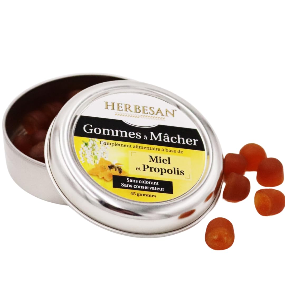 Honey and Propolis Chewing Gums. Food supplement based on Honey and Propolis. Herbesan gums are a combination of Propolis and tasty Honey. Propolis is a substance collected by bees and spread on the walls of the hive, thus giving the hive a natural barrier to external aggression. No coloring, no preservatives. Gelling Ingredients: Acacia Gum, Sugar, Glucose Syrup, Honey, Sugar Syrup, Propolis Extract, Natural Eucalyptus Flavor, Coating Agents: Coconut Oil, Carnauba Wax INGREDIENTS Gelling Agent: Acacia Gum, Sugar, Glucose Syrup, Honey, Sugar Syrup, Propolis Extract, Natural Eucalyptus Flavor, Coating Agents: Coconut Oil, Carnauba Wax. May contain traces of EGGS and NUTS. For 8 gums: Honey 407.2 mg, Raw Propolis 217 mg DIRECTIONS FOR USE Take one or two lozenges from its portable case, take them in the mouth and chew to savor its creaminess. Maximum 8 gums per day to chew to avoid the laxative effect. May contain traces of EGGS and NUTS. SAFETY WARNING It is recommended to respect the recommended doses, to ensure a varied and balanced diet and a healthy lifestyle. Keep out of reach of young children. Not recommended for people allergic to bee products. food supplement based on honey and propolis. Gommes à Mâcher Miel et Propolis. Complément alimentaire à base de Miel et Propolis. Les gommes Herbesan sont une association de Propolis et de Miel savoureux. La Propolis est une substance récoltée par les abeilles et étalée sur les parois de la rucheélle confère ainsi à la ruche une barrière naturelle aux agressions extérieures. Sans colorant, sans conservateur. Ingrédients Gélifiant : Gomme d'Acacia, Sucre, Sirop de Glucose, Miel, Sirop de Sucreéxtrait de Propolis, Arôme naturel Eucalyptus, Agents d'enrobage : Huile de Noix de Coco, Cire de Carnauba INGRÉDIENTS Gélifiant : Gomme d'Acacia, Sucre, Sirop de Glucose, Miel, Sirop de Sucre, Extrait de Propolis, Arôme naturel Eucalyptus, Agents d'enrobage : Huile de Noix de Coco, Cire de Carnauba. Peut contenir des traces d'ŒUFS et de FRUITS A COQUE. Pour 8 gommes : Miel 407,2mg , Propolis Brute 217 mg MODE D'EMPLOI Sortez une ou deux pastilles de son étui nomade, prenez-les en bouche et mâcher pour savourer son onctuosité.Maximum 8 gommes par jour à mâcher pour éviter l'effet laxatif.Peut contenir des traces d'ŒUFS et de FRUITS A COQUE. AVERTISSEMENT DE SÛRETÉ Il est recommandé de respecter les doses conseillées, de veiller à avoir une alimentation variée et équilibrée et un mode de vie sain.Tenir hors de portée des jeunes enfants. Déconseillé aux personnes allergiques aux produits de la ruche. complément alimentaire à base de miel et propolis.