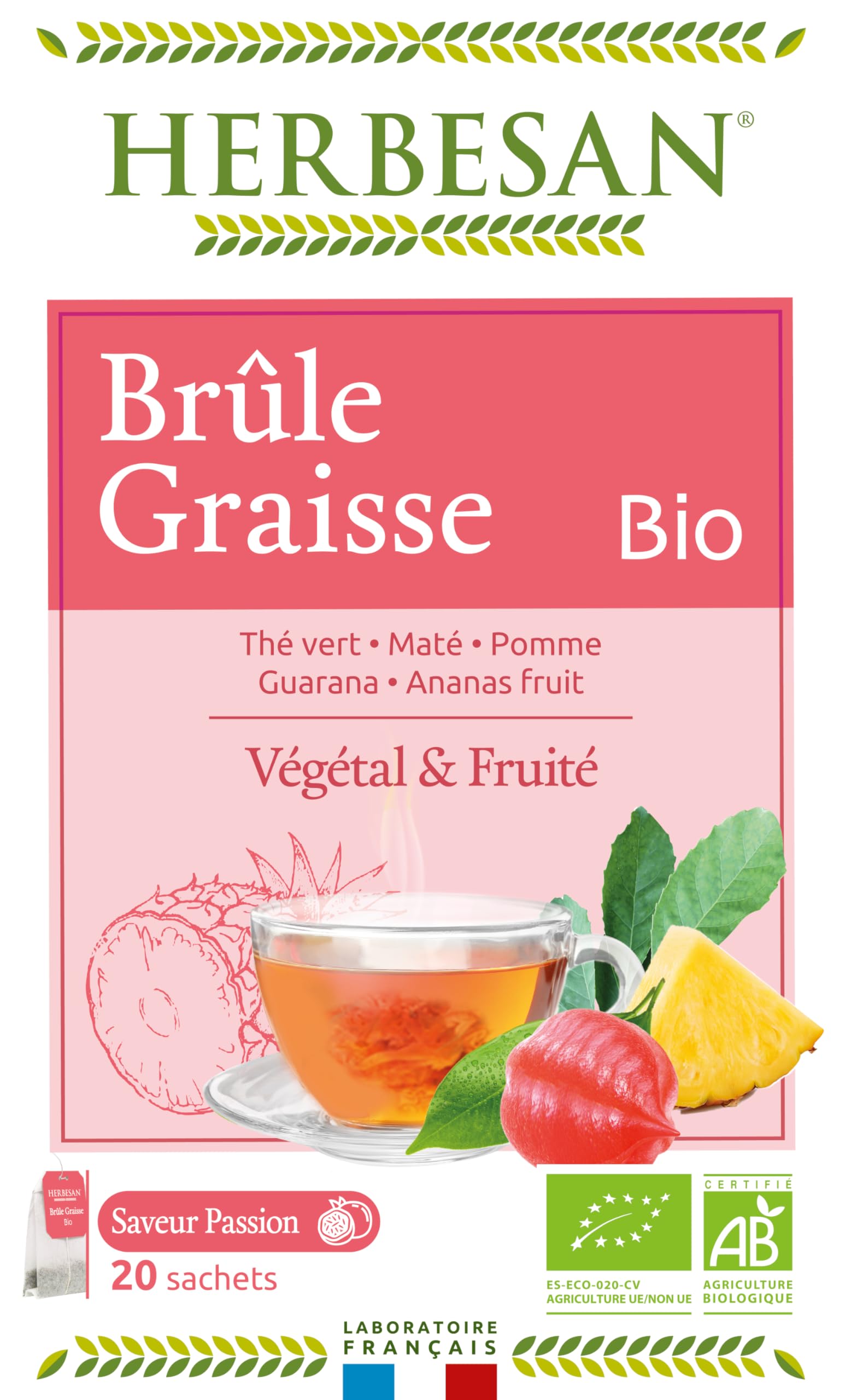 This Herbesan infusion combines different plants for a fat-burning action. INGREDIENTS Green tea (leaf) 50 , Green mate (leaf) 30 , Apple (fruit) 14 , natural Passion fruit flavor 5 , Guarana (seed) 0.8 , Pineapple (fruit) 0.2 DIRECTIONS FOR USE To enjoy the full intensity of the flavor and properties of the plants in your infusion, pour boiling water (approximately 200 ml) over one bag at a rate of 2 to 3 cups per day. Let it steep for 4 minutes before enjoying, preferably in the morning and or at midday. SAFETY WARNING To fully enjoy the flavor and herbal properties of your infusion, pour boiling water (approximately 200 ml) over one tea bag, drinking 2 to 3 cups per day. Let it steep for 4 minutes before enjoying, preferably in the morning and or at midday. Natural and effective products that meet all your needs. We develop and manufacture them in our workshops in Hauts-de-France. Experts in phytotherapy. HERBESAN is a French herbalist laboratory. OUR EXPERTISE?For 80 years. Cette infusion Herbesan associe diffÃrentes plantes pour une action brûle-graisse. INGRÉDIENTS Thé vert (feuille) 50 , Maté vert (feuille) 30 , Pomme (fruit) 14 , arôme naturel de Fruit de la passion 5 , Guarana (graine) 0,8 , Ananas (fruit) 0,2 MODE D'EMPLOI Afin de pouvoir savourer toute l'intensité de la saveur et des propriétés des plantes de votre infusion, versez de l'eau frémissante (environ 200 ml) sur un sachet à raison de 2 à 3 tasses par jour. Laisser infuser 4 minutes avant de déguster, de préférence le matin et ou le midi. AVERTISSEMENT DE SÛRETÉ Afin de pouvoir savourer toute l'intensité de la saveur et des propriétés des plantes de votre infusion, versez de l'eau frémissante (environ 200 ml) sur un sachet à raison de 2 à 3 tasses par jour. Laisser infuser 4 minutes avant de déguster, de préférence le matin et ou le midi. des produits naturels efficaces qui répondent à tous vos besoins. nous développons et fabriquons dans nos ateliers des Hauts-de-France. Expert en phytothérapie. HERBESAN est un laboratoire herboriste français. NOTRE EXPERTISE?Depuis 80 ans.