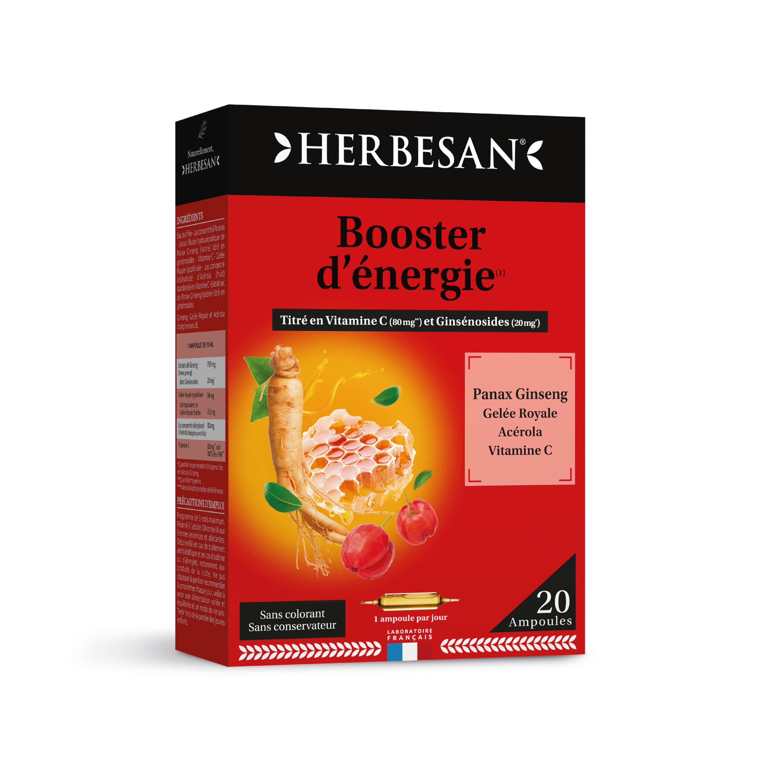 With Panax Ginseng Meyer which helps to preserve Tone and Energy and to reduce physical and intellectual fatigue. The formulation of this complex combines: Panax Ginseng Meyer, a root used in China for over 2000 years. Royal Jelly, exclusive food of the queen bee, who can live up to 40 times longer than a worker bee. Vitamin C. Acerola, a small fruit discovered in South America, commonly called West Indian Cherry, has juicy and tangy flesh. The plus of this formula: Ginseng which helps to preserve tone and energy. Vitamin C which helps reduce fatigue. No coloring, no preservatives. Ingredients Purified water - Concentrated Pineapple juice - Fluid extract of Panax Ginseng CA Meyer from Manchuria (root) - Vitamin C - Freeze-dried Royal Jelly - Dry extract of Acerola (fruit - Vitamin C) INGREDIENTS Purified water - Concentrated Pineapple juice - Fluid extract of Panax Ginseng CA Meyer from Manchuria (root) - Vitamin C - Freeze-dried royal jelly - Acerola dry extract (fruit-vitamin C) DIRECTIONS FOR USE Take 1 ampoule per day maximum, during a meal, preferably in the morning, diluted in half a glass of water. Program renewable several times a year. Program of 3 months maximum. SAFETY WARNING Not recommended for children under one year old, as well as in cases of asthma or allergies, particularly to bee products. Not recommended for pregnant and breastfeeding women. Not recommended in case of antidiabetic treatment or hypertension. Consult your doctor in case of diabetes or cardiovascular diseases, and in case of simultaneous taking of medications. Program of 3 months maximum. It is recommended to respect the recommended doses, to ensure that you have a varied and balanced diet and a healthy lifestyle. Keep out of reach of young children. Oral use only - not suitable for injection. FOOD SUPPLEMENT IN AMPOULES - Based on Panax Ginseng CA Meyer, Royal Jelly, Vitamin C and Acerola, resulting from HERBESAN research, specialist in food supplements for 80 years. Au Panax Ginseng Meyer qui contribue à préserver Tonus et Energie et à réduire la fatigue physique et intellectuelle. La formulation de ce complexe associe : Le Panax Ginseng Meyer, racine utilisée en Chine depuis plus de 2000 ans. La Gelée Royale, nourriture exclusive de la reine des abeilles, qui peut vivre jusqu'à 40 fois plus longtemps qu'une abeille ouvrière. La Vitamine C. L'Acérola, petit fruit découvert en Amérique du Sud, communément appelé Cerise des Antilles, possède une chair juteuse et acidulée. Le plus de cette formule Le Ginseng qui contribue à préserver tonus et énergie. La Vitamine C qui contribue à réduire la fatigue. Sans colorant sans conservateur. Ingrédients Eau purifiée - Jus concentré d'Ananas - Extrait fluide de Panax Ginseng CA Meyer de Mandchourie (racine) - Vitamine C - Gelée Royale lyophilisée - Extrait sec d'Acérola (fruit - Vitamine C) INGRÉDIENTS Eau purifiée - Jus concentré d'Ananas - Extrait fluide de Panax Ginseng CA Meyer de Mandchourie (racine) – Vitamine C – Gelée royale lyophilisée – Extrait sec d'acérola (fruit- vitamine C) MODE D'EMPLOI Prendre 1 ampoule par jour maximum, au cours d'un repas, de préférence le matin, à diluer dans un demi-verre d'eau. Programme renouvelable plusieurs fois dans l'année. Programme de 3 mois maximum. AVERTISSEMENT DE SÛRETÉ Déconseillé aux enfants de moins d'un an, ainsi qu'en cas d'asthme ou d'allergies, notamment aux produits de la ruche. Déconseillé aux femmes enceintes et allaitantes. Déconseillé en cas de traitement antidiabétique ou d'hypertension. Consultez votre médecin en cas de diabète ou de maladies cardiovasculaires, et en cas de prise simultanée de médicaments. Programme de 3 mois maximum. Il est recommandé de respecter les doses conseillées, de veiller à avoir une alimentation variée et équilibrée et un mode de vie sain. Tenir hors de la portée des jeunes enfants. Usage oral uniquement - ne convient pas en injection. COMPLÉMENT ALIMENTAIRE EN AMPOULES - À base de Panax Ginseng CA Meyer, Gelée royale, Vitamine C et Acérola, issu de la recherche HERBESAN, spécialiste des compléments alimentaires depuis 80ans.