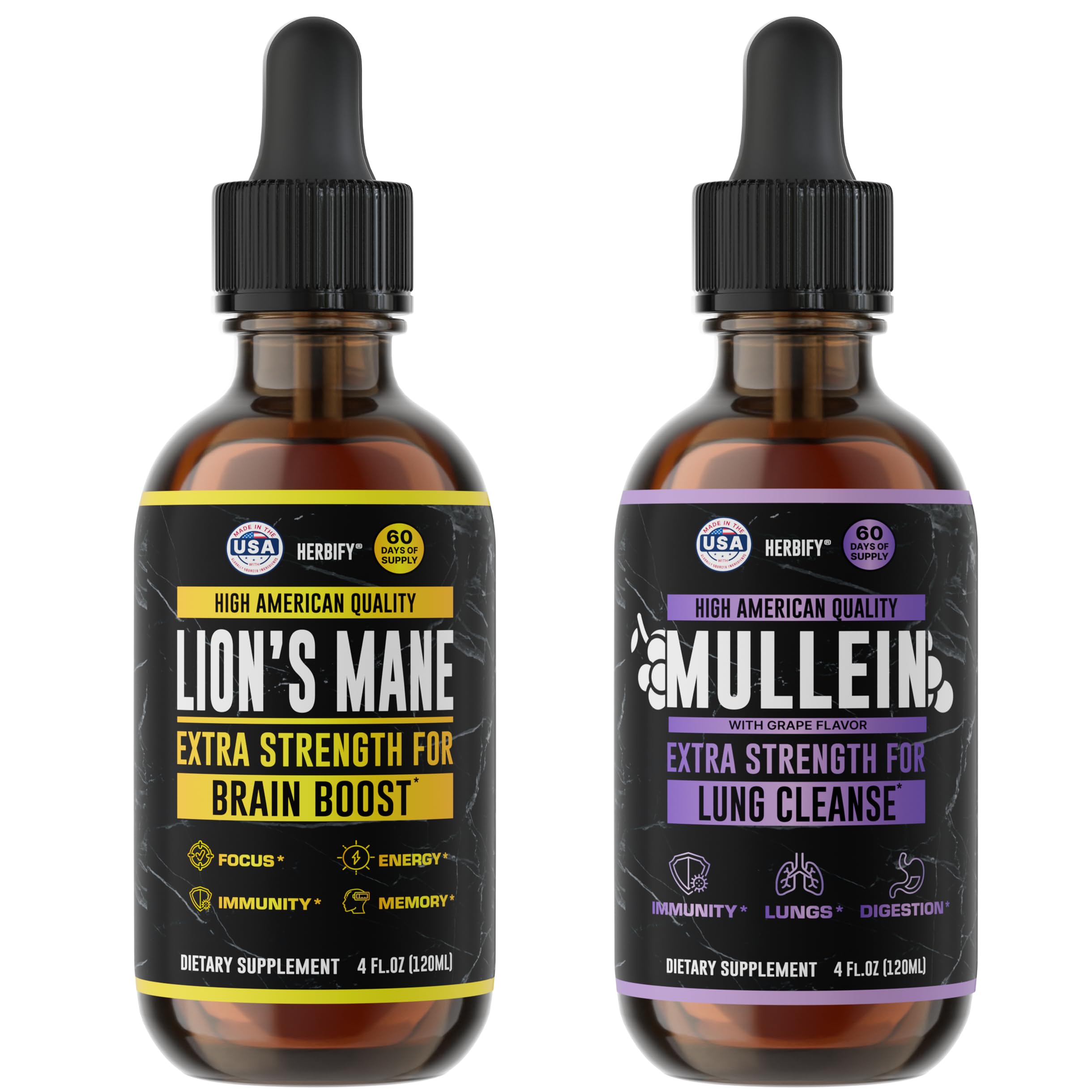HERBIFY Bundle - Lions Mane & Mullein Grape 4 Fl Oz Drops - Supplement for Memory Focus & Clarity & Immune Support Lung Cleanse and Bronchial Support