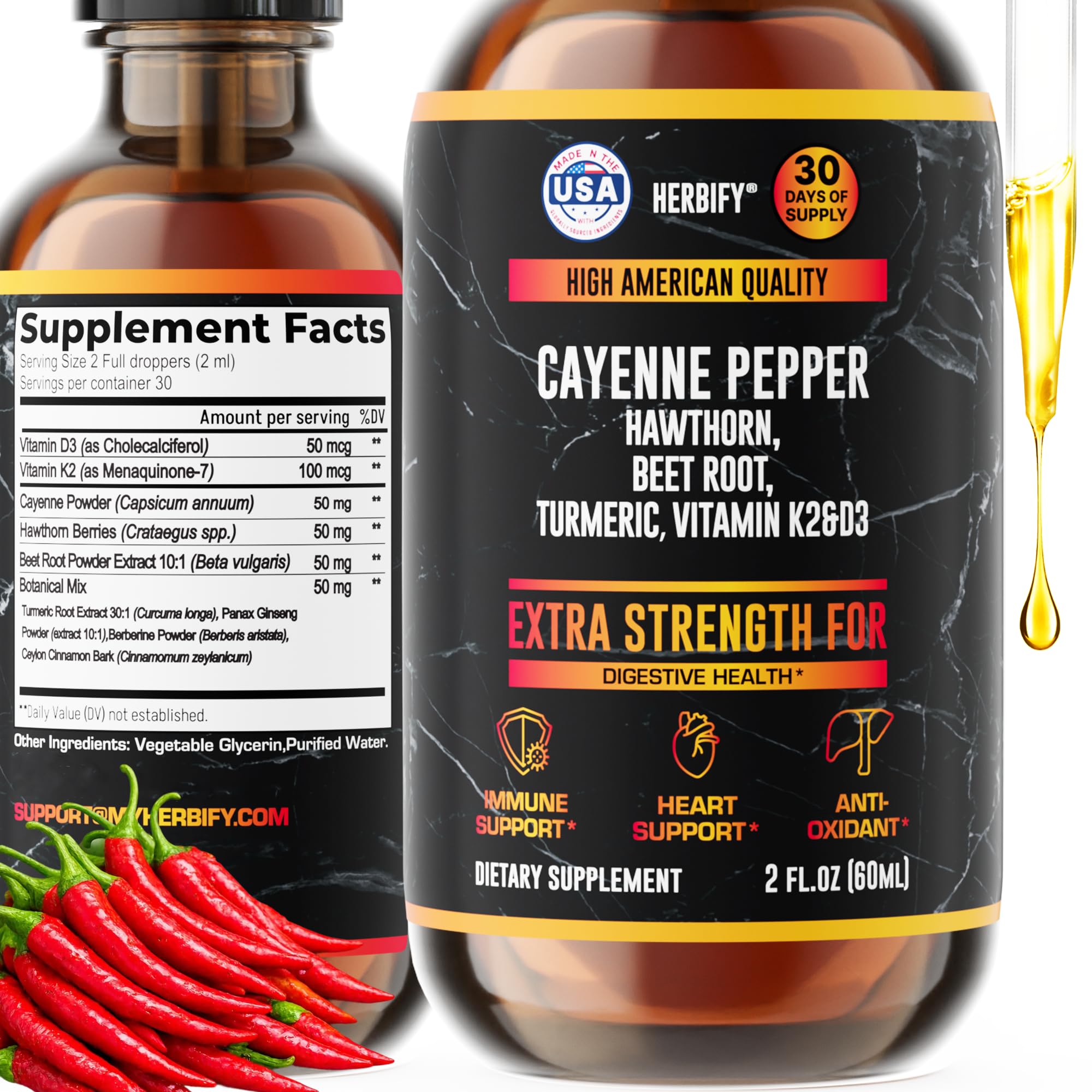 HERBIFY Cayenne Pepper Drops - Immune Support Supplement - Detox & Digestion Support - Cayenne Pepper Hawthorn Beet Root Turmeric Vitamin K2 D3 - Energy Supplements Extract - 2 Fl Oz - Made in USA