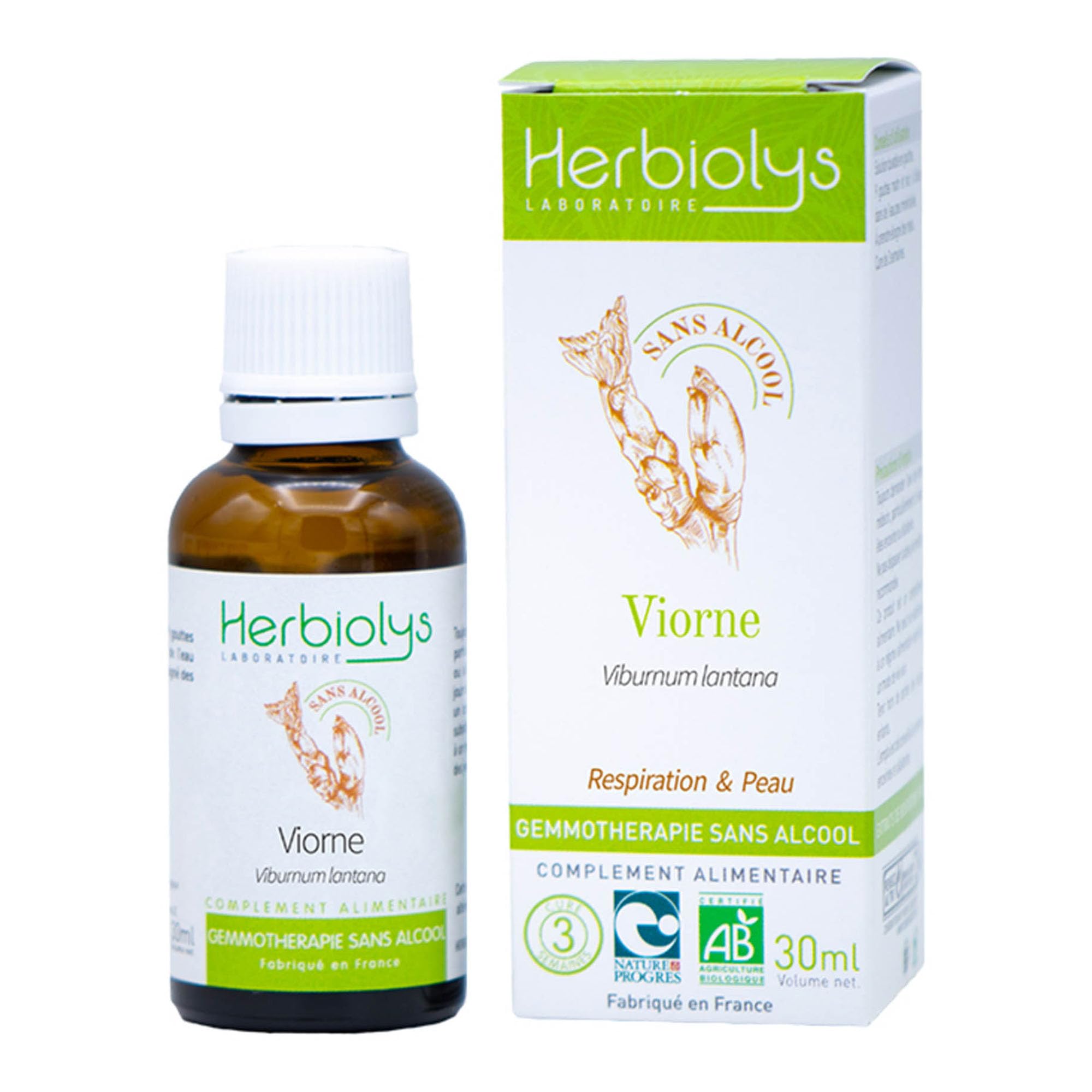 Macérât De Bourgeon Bio Sans Alcool Gemmothérapie Flacon de 30 ml Herbiolys (30 ml, Viorne)