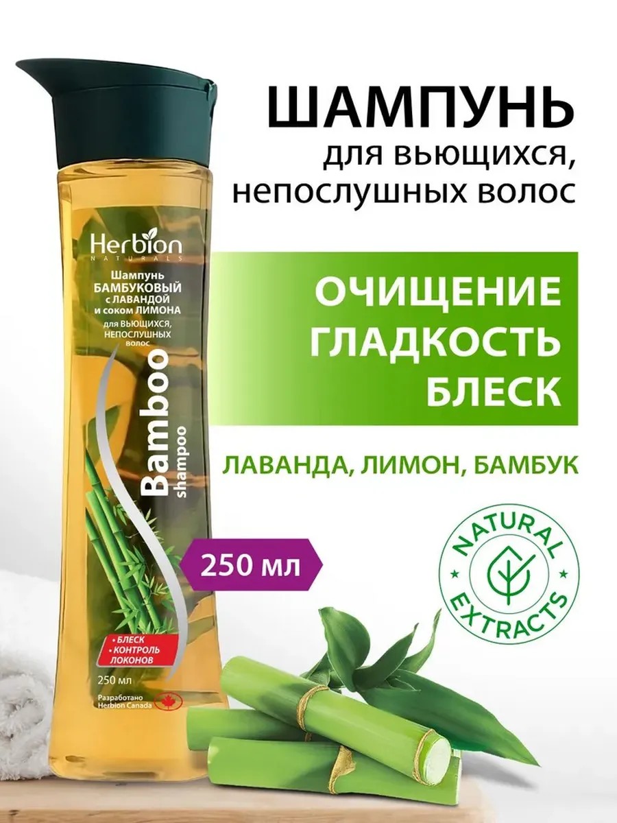 Откройте для себя естественную силу шампуня Herbion с экстрактом бамбука, маслом лаванды и соком алоэ вера.