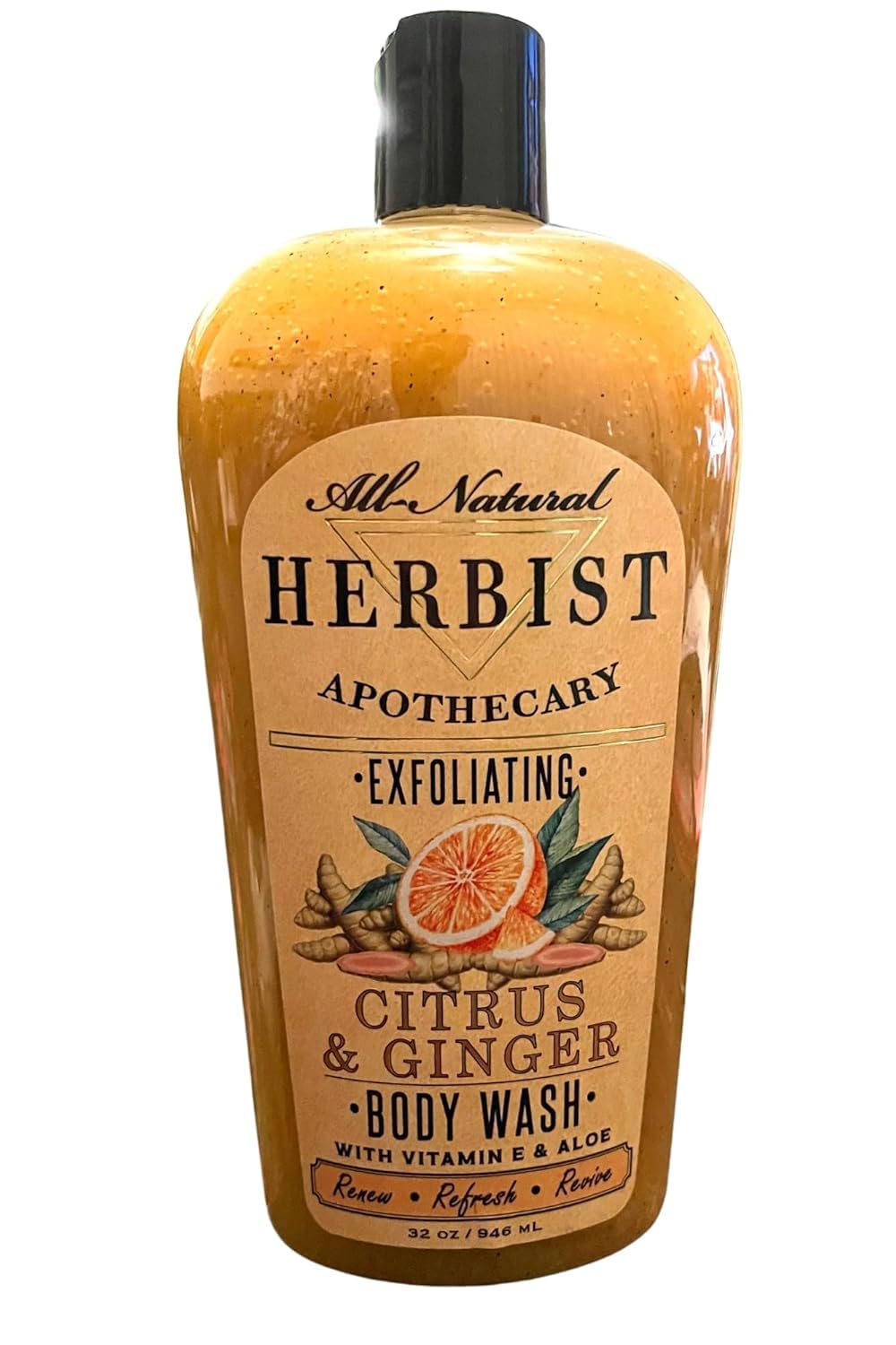 Herbist All Natural Apothecary Exfoliating Citrus and Ginger Body Wash with Vitamin E and Aloe. Renew. Refresh. Revive. Made with Fresh Ingredients. No harmful ingredients ever. Biodegradable & Everyday Safe. Vegan. Natural & Cruelty Free. Made with High Quality Extracts. Sulfate Free. Paraben Free. Locally grown. Sustainable. Plant based. 32 OZ. 946ml