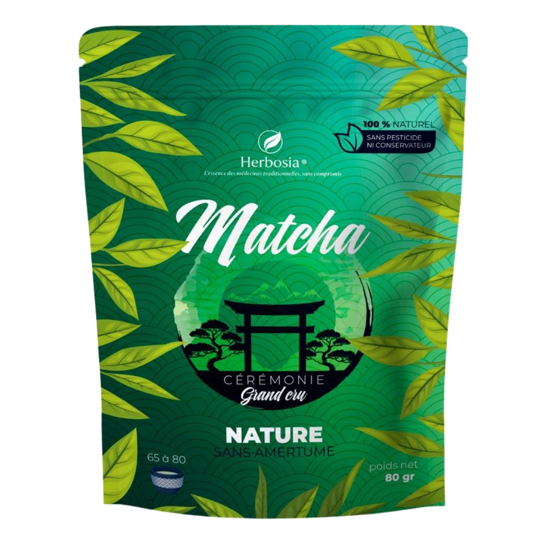 Herbosia Ceremonial Matcha embodies the absolute excellence of Japanese tea. Made from the first harvest of carefully shaded young Tencha leaves, it is then ground on granite stones to create an exceptionally fine powder with an incomparably vibrant green hue. The highest quality matcha in the world. Far surpassing "premium" and "culinary" grades, Herbosia matcha is renowned for: its exceptional purity, its silky texture, its smooth, non-bitter taste, and its natural richness in L-theanine and antioxidants. Each sip reveals a perfect balance between energy and serenity, thanks to L-theanine, which works in synergy with the natural caffeine in green tea to provide lasting vitality and mental calm. A natural source of powerful antioxidants. This ceremonial matcha concentrates the catechins and polyphenols of Japanese green tea, known for their role in cell protection and overall vitality. Generous size and complete ritual. Each pouch contains 80g of pure matcha, enough for 60 to 80 preparations, along with a bamboo measuring spoon for perfect portioning and to preserve the tradition of Japanese chanoyu. Red Fruit Matcha – Raspberry Blueberry. A balanced blend of the purest matcha and real freeze-dried fruit. Raspberry and blueberry provide a naturally sweet touch, rich in antioxidants and vitamin C, with no added flavoring. Exotic Fruit Matcha – Mango Pineapple. A tropical and sunny version, blending Herbosia ceremonial matcha with 100 natural mango and pineapple. An explosion of sweetness, freshness, and antioxidant benefits. ? Preparation instructions: Sift 1 scoop (˜ 1 g). Add 70–100 ml of hot water (75–80 C). Whisk in "M" or "W" motion until a fine foam forms. Enjoy neat, as a matcha latte, or in a fruit smoothie.HERBOSIA Matcha Japonais – Qualité Cérémonie – Riche en L-Théanine Antioxydants – Sans Amertume – 100 Naturel – 80 g Cuillère Doseuse Incluse (80g, Nature) Nature 80 g (Lot de 1)DESCRIPTION DU PRODUIT Le Matcha Cérémonial Herbosia incarne l'excellence absolue du thé japonais. Issu de la première récolte de jeunes feuilles de Tencha, soigneusement ombrées, il est ensuite broyé sur pierre de granit pour donner naissance à une poudre d'une finesse extrême et d'un vert éclatant incomparable. La plus haute qualité de matcha au monde Bien au-dessus du grade "premium" et du "culinaire", le matcha Herbosia est reconnu pour : Sa pureté exceptionnelle, Sa texture soyeuse, Son goût doux, sans amertume, Et sa richesse naturelle en L-théanine et antioxydants. Chaque gorgée révèle un équilibre parfait entre énergie et sérénité, grâce à la L-théanine qui agit en synergie avec la caféine naturelle du thé vert pour offrir vitalité durable et calme mental. Une source naturelle d'antioxydants puissants Ce matcha cérémonial concentre les catéchines et polyphénols du thé vert japonais, reconnus pour leur rôle dans la protection cellulaire et la vitalité générale. Format généreux et rituel complet Chaque sachet contient 80 g de matcha pur, soit 60 à 80 préparations, accompagné d'une cuillère doseuse en bambou pour doser parfaitement et préserver la tradition du chanoyu japonais. Matcha Fruits Rouges – Framboise Myrtille Un mélange équilibré du matcha le plus pur et de vrais fruits lyophilisés. La framboise et la myrtille apportent une touche naturellement sucrée, riche en antioxydants et vitamine C, sans arôme ajouté. Matcha Fruits Exotiques – Mangue Ananas Une version tropicale et solaire, mêlant le matcha cérémonial Herbosia à la mangue et à l'ananas 100 naturels. Une explosion de douceur, de fraîcheur et de bienfaits antioxydants. ? Conseils de préparation Tamisez 1 cuillère doseuse (˜ 1 g). Ajoutez 70–100 ml d'eau chaude (75–80 C). Fouettez en "M" ou "W" jusqu'à formation d'une mousse fine. Dégustez pur, en matcha latte ou en smoothie fruité.