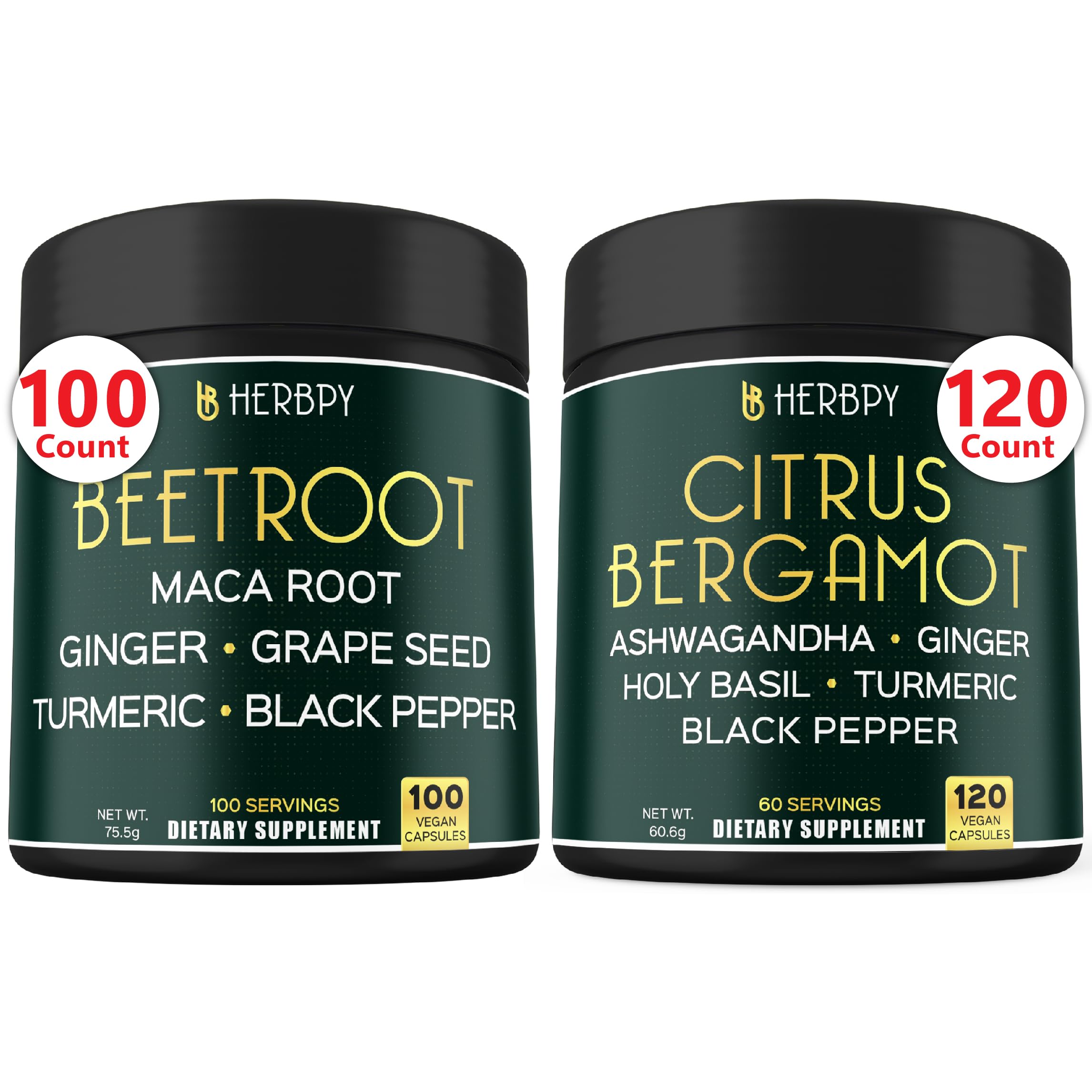 ✓ Incorporate Herbpy Plant-based capsules into your daily routine. Confidently purchase with 's reliable return and refund policies. Customer satisfaction is our happiness!. ✓ Discover HERBPY's natural herbal supplements, with carefully selected herbal ingredients, vegan capsules, and added vitamins—perfect for a balanced lifestyle. ✓ 1 Pack 120 Count - HERBPY Citrus Bergamot Capsules - Blend of Citrus Bergamot, Ashwagandha, Holy Basil, Turmeric Curcumin, Ginger Root, and Black Pepper. Recommendation: 2 Citrus pills daily. ✓ 1 Pack 100 Count - HERBPY 6in1 Beetroot Supplements Plus Maca Root, Grape Seed, Ginger Root, Turmeric Curcumin and Black Pepper - Recommendation: Take 1 Beetroot capsule daily.