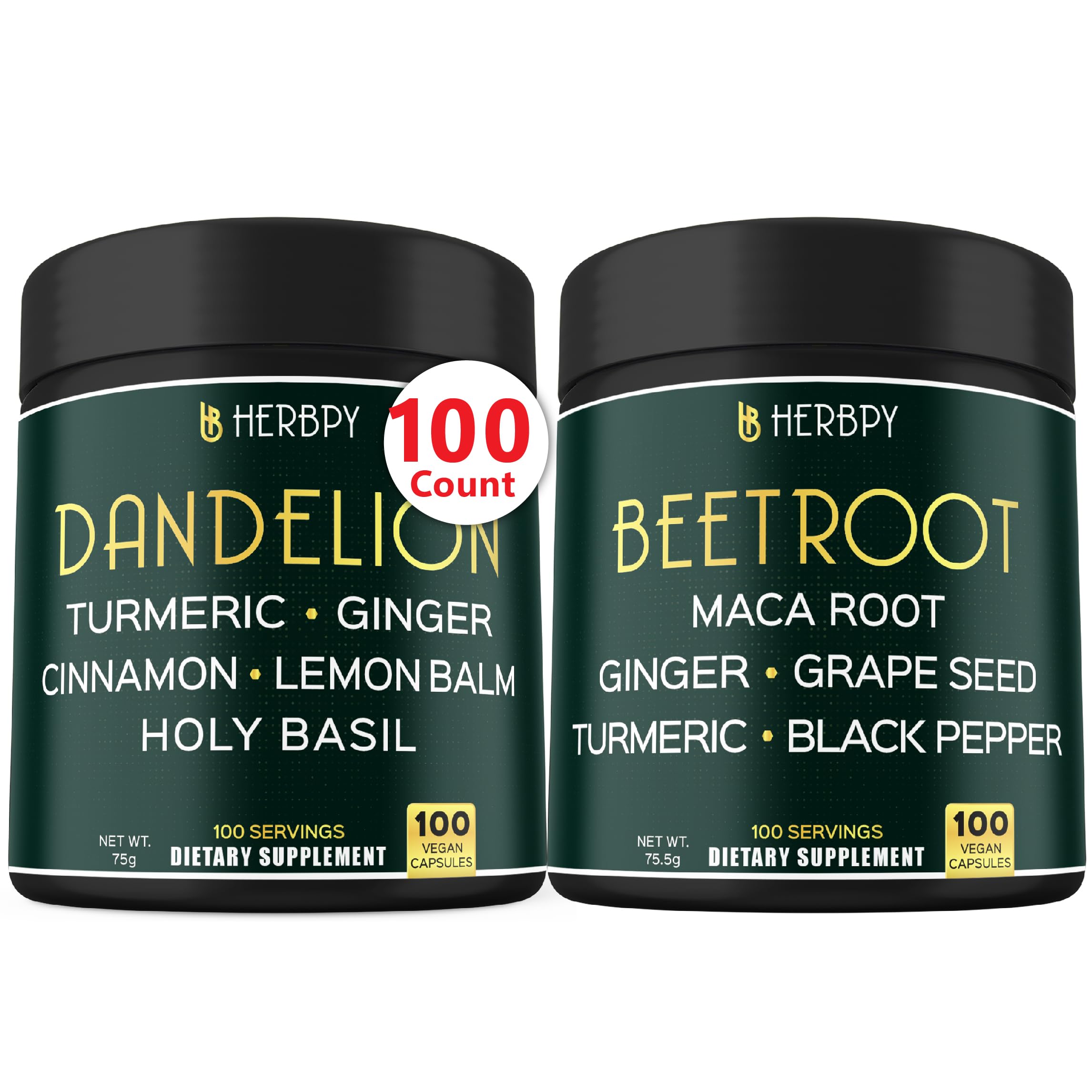 ✓ Incorporate Herbpy Plant-based capsules into your daily routine. Confidently purchase with 's reliable return and refund policies. Customer satisfaction is our happiness!. ✓ Safety First – Herbpy's daily herbal supplement capsules are vegan-friendly, meet U.S. standards, and are rigorously tested for purity and quality. They are produced in FDA-registered, GMP-certified, ISO, and Halal-compliant facilities. ✓ Discover HERBPY's natural herbal supplements, made to support your daily health with carefully selected herbal ingredients, vegan capsules, and added vitamins—perfect for a balanced lifestyle. ✓ 1 Pack 100 Count - HERBPY 6in1 Beetroot Supplements Plus Maca Root, Grape Seed, Ginger Root, Turmeric Curcumin and Black Pepper for Heart Health, Digestion Immune Support - Recommendation: Take 1 Beetroot capsule daily. ✓ 1 Pack 100 Count - HERBPY 6in1 Dandelion Root Supplement supports Immune, Heart, and Digestive Health with Ginger Root, Turmeric Curcumin, Ceylon Cinnamon, Lemon Balm, and Holy Basil - Recommended use: 1 Dandelion pill daily.