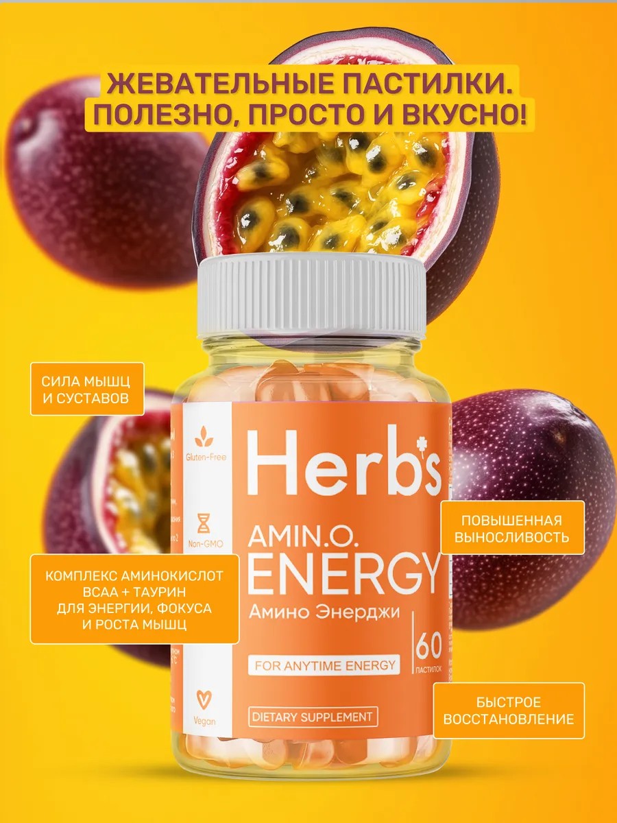 Вкусно – в отличие от капсул или таблеток, мармеладные БАДы обладают мягкой консистенцией и приятным вкусом (фруктовым, ягодным, цитрусовым и др.), что особенно важно для детей и людей, чувствительных к горечи лекарственных форм. Биологически активная добавка "Амино Энерджи" от HERB'S имеет яркий апельсиновый запах и вкус.