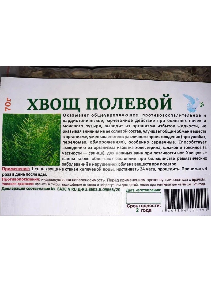 Horsetail herb has diuretic, hemostatic, astringent, antiseptic, and anti-inflammatory properties, and promotes wound healing.