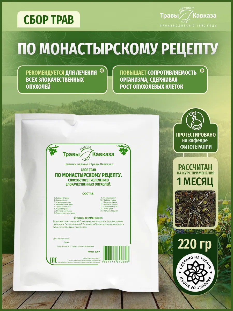 The collection according to the Monastic recipe is recommended for the treatment of all malignant tumors, regardless of their location, improves the general condition and emotional mood of the patient, increases the body's resistance, inhibiting the growth of tumor cells.