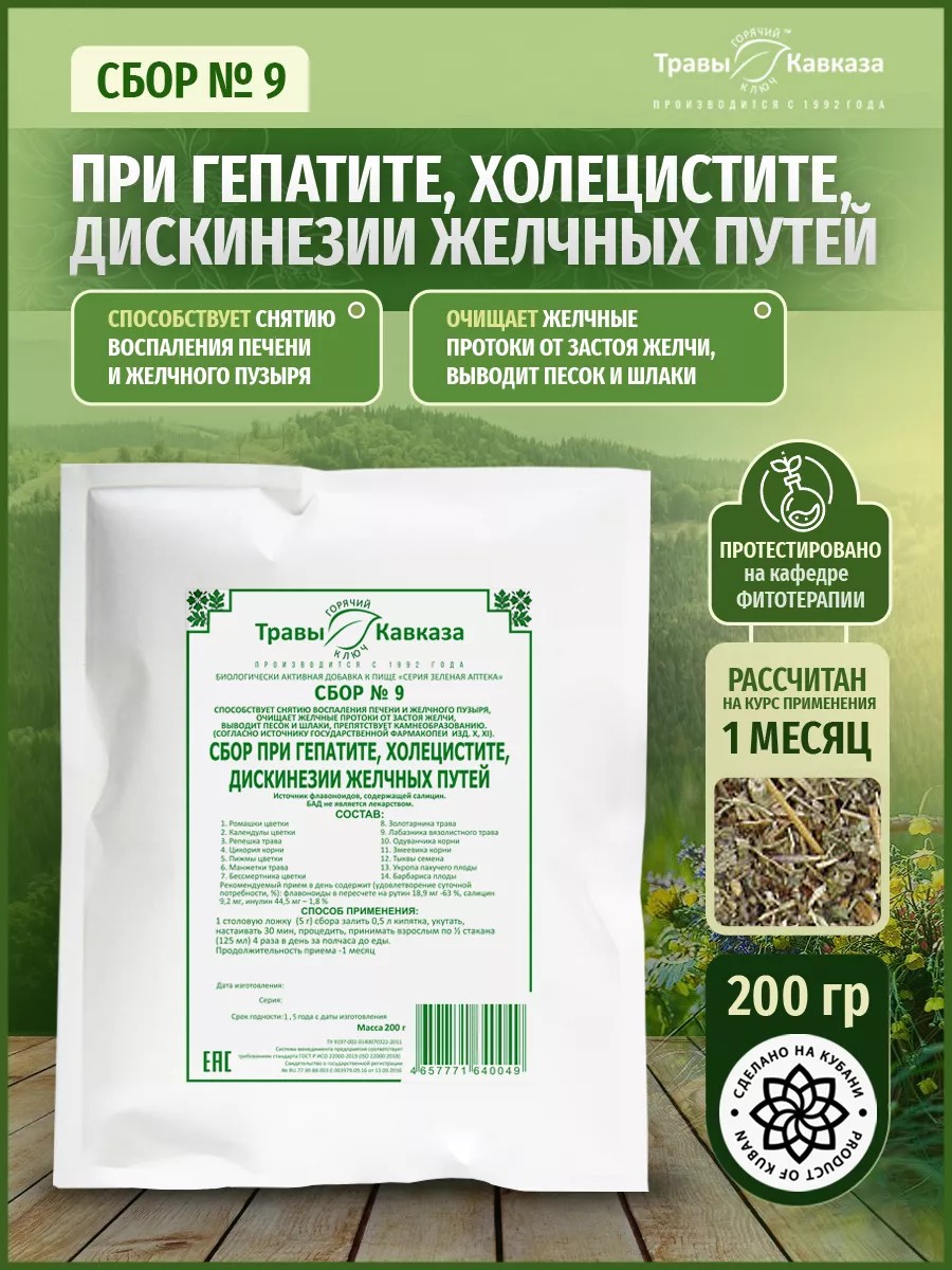 Сбор № 9 При гепатите, холецистите, дискинезии желчных путей способствует снятию воспаления печени и желчного пузыря, очищает желчные протоки от застоя желчи, выводит песок и шлаки, препятствует камнеобразованию.Травы, входящие в состав сбора способствуют разжижению желчи, нормализации ее состава, оказывают желчегонный и противовоспалительный эффекты, восстанавливают работу печени календула, пижма, бессмертник, золотарник, лабазник, барбарис, трава репешка. Ромашка, манжетка используются в сборе в качестве природного антибиотика, обладают сильным противоинфекционным, противовоспалительным действиями, а также корень змеевика, корень одуванчика и цикория. Очищающий эффект оказывают плоды укропа и семена тыквы, цикория корни.