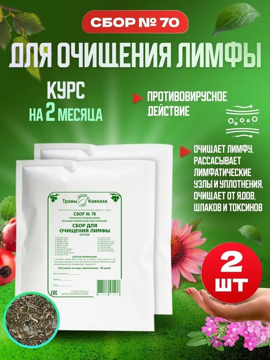 Набор для полного курса. СГР RU.77.99.88.003.Е.003874.09.16 Травы Кавказа / Травяной сбор для очищения лимфы / противовирусный /при заболевании щитовидной железы / сбор 70 200 гр Травяной сбор очищает лимфу, рассасывает лимфатические узлы и уплотнения. Сбор входит в состав очищающей организм линейки, имеет в составе противовирусные и противоинфекционные компоненты. Почки березы, почки черного тополя, почки сосны, корень цикория, шалфей имеют противовирусное действие. Сбор способствует рассасыванию уплотнений лимфоузлов, снимает воспалительные процессы лимфатической системы, очищает от ядов, шлаков и токсинов. Этот сбор также эффективен в качестве профилактики при заболевании щитовидной железы. Выводит лишнюю жидкость из организма и продукты распада, применяется в качестве профилактики новообразований, при папилломах и бородавках. Играет важную роль при похудении. Хороший эффект достигается при чередовании сбора № 70 со сбором № 62. (Травы кавказа, чай травяной сбор, щитовидная железа, папиломы, травянной сбор, корень одуванчика чай, папилома, паппиломы, от паппиломы, травяной сбор в пакетиках, чай из корня одуванчика, цветы бузины). Алтайские травы / успокоительное для взрослых / для иммунитета / магний / иммуномодулятор, замедляет процессы старения