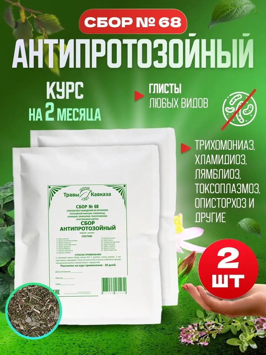 Набор для полного курса. Травяной сбор №68 - антипаразитарный комплекс для человека, применяется при состояниях, вызванных протозойной инфекцией: трихомонадами, хламидиями, лямблиозом, токсоплазмозом, описторхозом и другими. Натуральный противогрибковый сбор выполнен из растений, которые убивают инфекцию, вирусы, грибки, паразитов. Противопаразитарный фито чай способствует истреблению лямблии в печени, снимает воспаления печени, восстанавливает ее функцию. Также паразитарный фитосбор (фиточай) от гельминтов убивает личинки аскарид, острицы во всех внутренних органах. В составе сбора присутствуют кавказские лечебные (лекарственные) травы - пижма, семена расторопши, иссоп трава с хорошим противоглистным антигельминтным эффектом от глистов (глист) для детей и взрослых. Дополнительно можно использовать кору осины. Данное паразитарное, глистогонное средство способствует санации от паразитов не только из желудочно-кишечного тракта (жкт), но и из других внутренних органов, а также чистит лимфу и кровь. Желудочный сбор антипаразит также эффективен при лечении трихомонадного кольпита, хламидий и других паразитов живущих в организме. В состав сбора 68а также входят листья березы,грецкого ореха и эвкалипта, корни девясила и лопуха, золототысячник зонтичный, спорыш, семена тыквы, тысячелистник и цикорий.