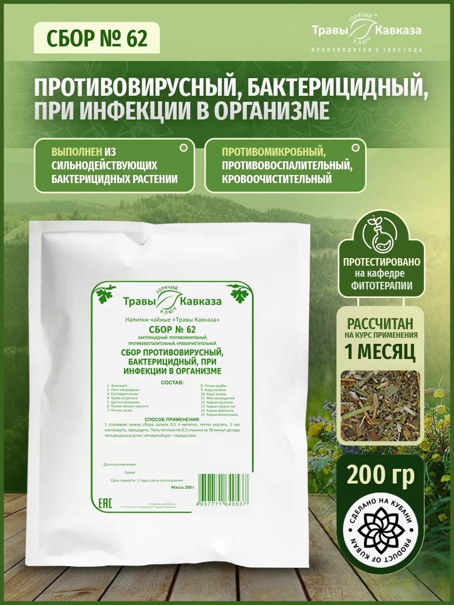Травяной сбор № 62 выполнен из сильнодействующих бактерицидных алтайских и кавказских лекарственных трав. Лечебный сбор обладает противомикробными, противовоспалительными, жаропонижающими и кровоочистительными функциями для человека. Чайный напиток убивает вирус в организме и снижает температуру, он с легкостью заменит любые противовирусные таблетки, сиропы от кашля и teraflu. Благодаря эхинацеи в составе, натуральный горный фиточай можно использовать в качестве профилактики для повышения иммунитета при частых простудах, заболеваниях ОРВИ, ОРЗ и гриппе и герпесе. Этот полезный грудной фито сбор можно назвать растительным антибиотиком (лекарством), т.к. набор трав и корней, входящий в состав направлен на уничтожение микроорганизмов, вызывающих всякого рода инфекции. Данное средство помогает снять отек носа и боль в голе при сильном насморке, тонзиллите … Девясил, мох исландский, почки сосны, входящие в состав заварочного чая, разжижают и выводят мокроту при сильном кашле, хроническом бронхите и воспалении легких у детей и взрослых (пневмонии). В составе также содержатся такие травы как кора калина и осины, копеечник, плоды ольхи, ромашка, листы черной смородины, почки тополя, вербы, а также корни касатика и герани.