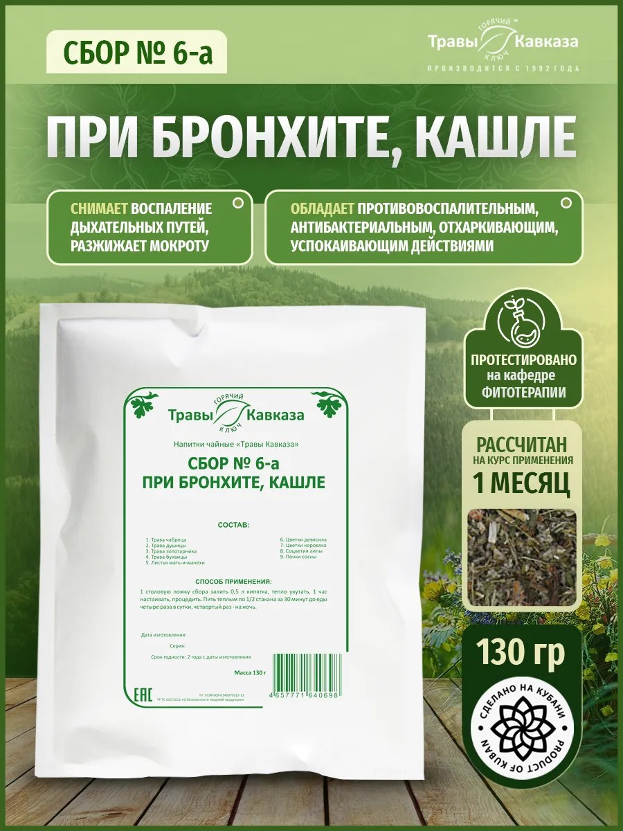 Сбор при бронхите и кашле № 6-а обладает мощным противовоспалительным, антибактериальным и отхаркивающим действием. Он эффективно снимает воспаление дыхательных путей и способствует разжижению мокроты, что делает его незаменимым средством при неосложненных заболеваниях верхних дыхательных путей, таких как ОРЗ, ОРВИ, трахеит, ларинготрахеит и бронхит. Особенно рекомендуется для детей при простудах с сухим и влажным кашлем.