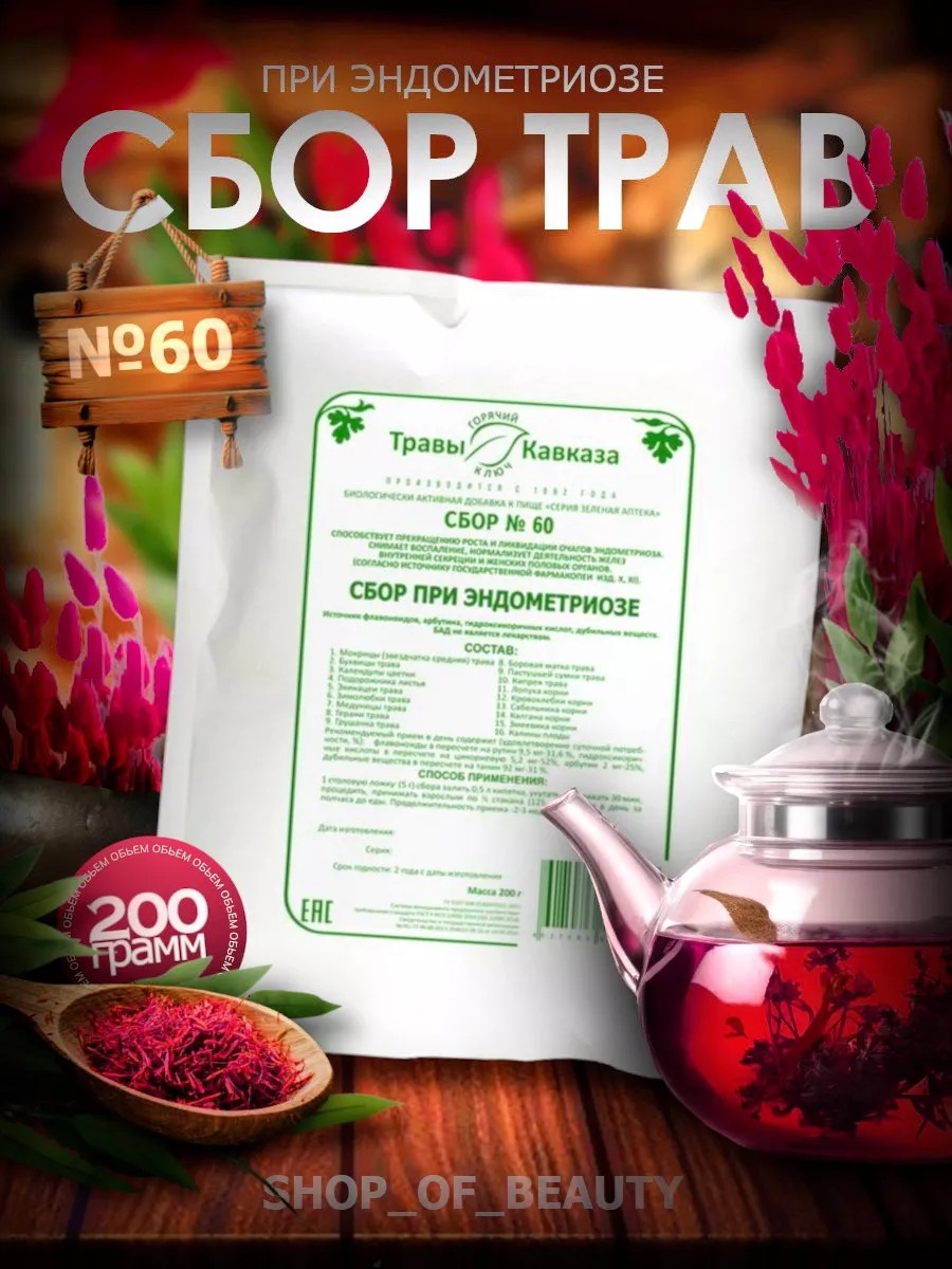 Способствует прекращению роста и ликвидации очагов эндометриоза. Снимает воспаление. Нормализует деятельность желез внутренней секреции и женских половых органов. Способствует восстановлению эндометрий (внутренней слизистой оболочки тела матки).В некоторых моментах схож с составом 59 сбора, т.к.тоже направлен на снятие воспаления мочеполовой системы, восстанавливает нарушенный гормональный обмен веществ, но в его усиление добавлены высокоэффективные компоненты, которые способствуют рассасыванию новообразований при наличии кист, миом, полипов.Герань, змеевика корень, калины кора, буквица, боровая матка, зимолюбка- убивают инфекцию, способствуют выработке женских гормонов.Грушанка, боровая матка, календула, калган, зимолюбка, сабельник, лопух, медуница и мокрица снимают воспаление и восстанавливают обмен веществ, противоопухолевые средства. Пастушья сумка, калина, подорожник, кипрей имеет сильное противовоспалительное действие. Эхинацея укрепляет жизненные силы организма для борьбы с заболеванием.