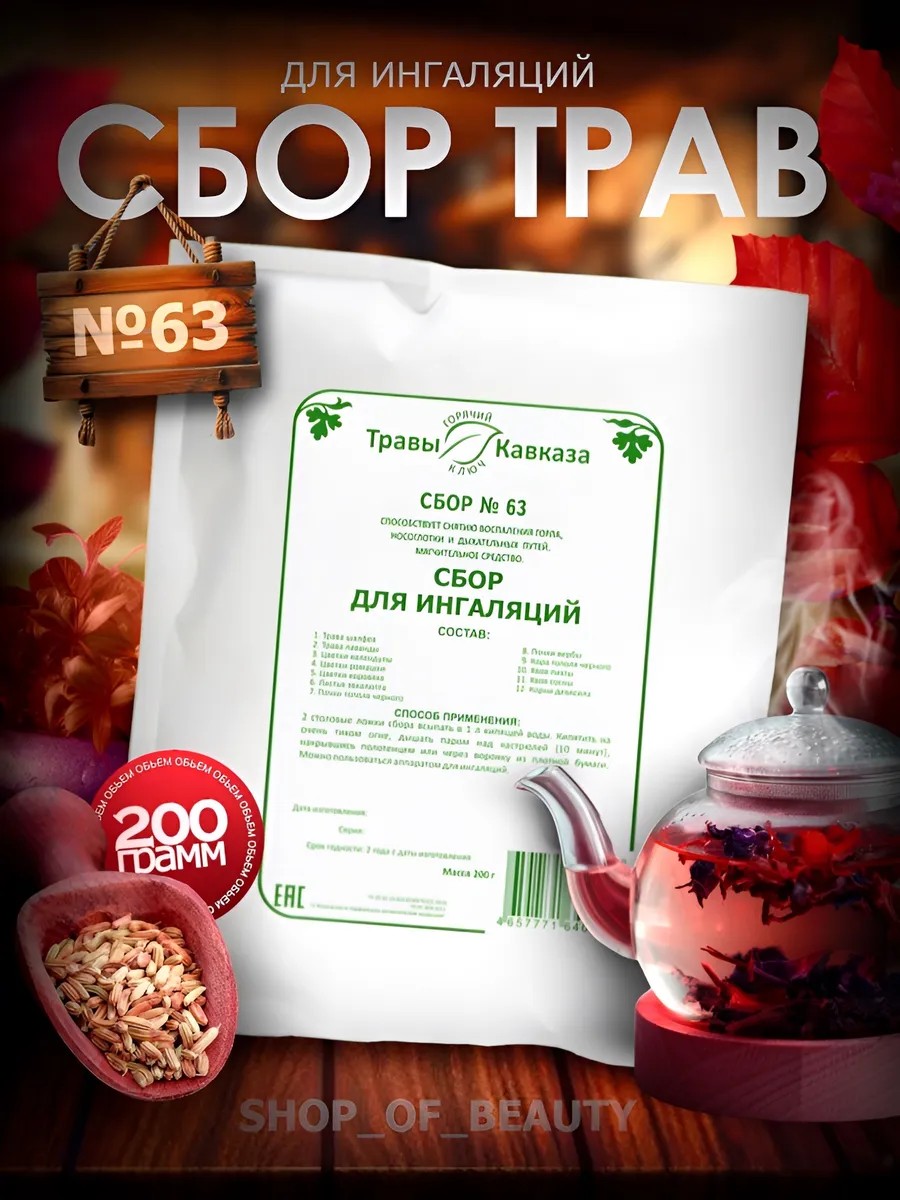 Травяной сбор № 63 от «Травы Кавказа», 200 г, применяется для ингаляций. Данный сбор травяной снимает воспаление горла, носоглотки и дыхательных путей. Мягчительное средство. Имеет противовоспалительное, сосудорасширяющее, противоинфекционное, противовирусное, отхаркивающее свойства. Сбор для ингаляций содержит следующие компоненты. Девясил высокий (корни). Календула лекарственная (ноготки, цветки). Коровяк (трава). Лаванда лекарственная (цветки). Ромашка (цвет ромашки аптечной). Шалфей лекарственный (листья). Эвкалипт (эвкалипта круглого листья). Тополь черный (почки). Верба (почки), Тополь черный (кора). Хвоя пихты. Хвоя сосны. Как применять сбор № 63. Две столовые ложки сбора всыпать в 1 л кипящей воды. Кипятить на очень тихом огне около 5-7 минут, дышать паром над кастрюлей (10-12 минут), накрывшись полотенцем или через воронку из плотной бумаги. Ингаляции можно проводить любым методом - компрессорным распылением и горячим паром. Процедуру повторять 2-3 раза в день. Рекомендуем применять сбор строго согласно инструкции! Кристально чистый воздух и микроклимат предгорий Кавказского хребта - все это способствует тому, что сбор травяной лечебный от «Травы Кавказа» обладает большой природной силой и оказывает благотворное воздействие на здоровье человека. Наше производство находится в городе-курорте Горячий ключ, который известен знаменитыми источниками минеральных вод, а также целебными травами, растущими в естественных условиях. Благодаря уникальным условиям, созданным природой, мы можем дарить людям травяной сбор, который вобрал в себя всю силу и энергетику этого прекрасного места. Продукт протестирован на кафедре фитотерапии.