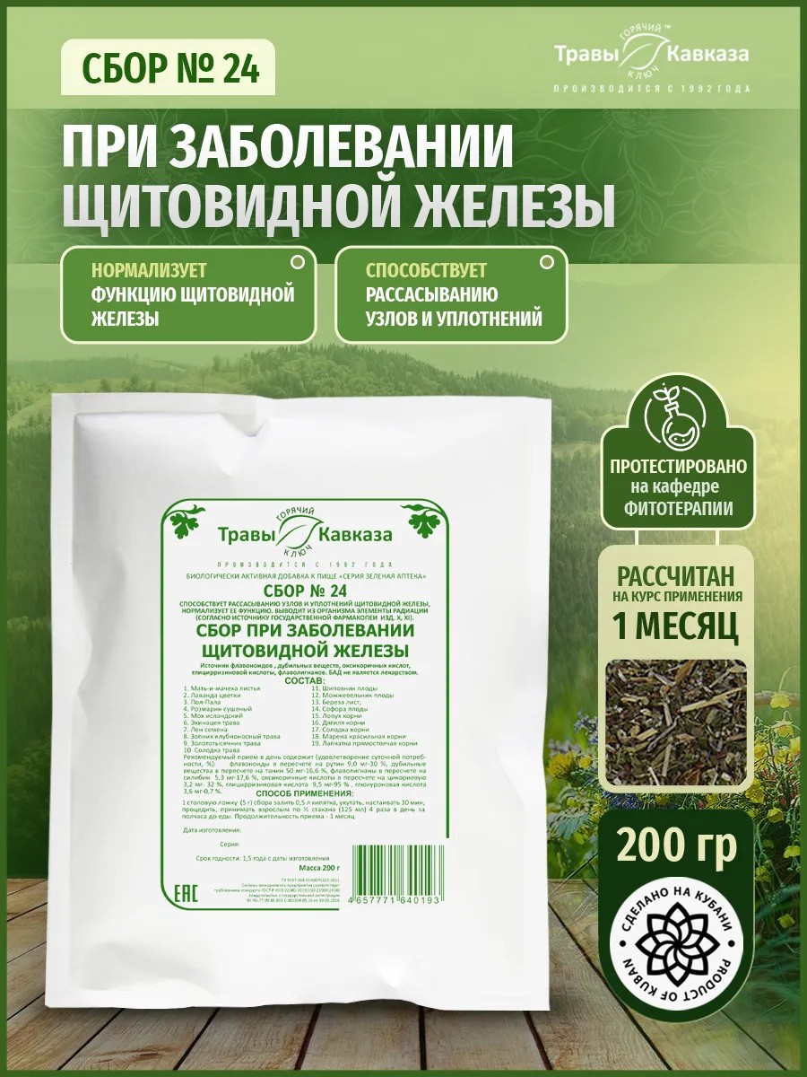 Травяной сбор №24 Травы Кавказа — это натуральное средство, состоящее из сушеных лекарственных трав, которое используется для поддержания здоровья щитовидной железы и эффективного функционирования эндокринной системы. Благодаря траве пол-пала, золототысячник и лапчатка в составе, данный очищающий алтайский чай способствует нормализации йодного (йод) баланса и гормонального фона, может быть эффективен для похудения, что важно для нашей щитовидки. Растительный комплекс полезен при гипотиреозе, гипертиреозе, тиреоидите и болезни Хашимото, предотвращает образование узлов и узлового зоба, борется с раком (онкологией) щитовидки,выводит шлаки и токсины, а также улучшает обмен веществ. Экстракт эхинацеи способствует повышению иммунитета и борется с усталостью организма, а также полезен для желудка и кишечника. Лечебная настойка может помочь при симптомах сахарного диабета (сахар) и является поддерживающим средством для сосудов и суставов. Успокоительный фитосбор алтай– витамины для сил, энергии и бодрости, которые помогают справляться восстановиться после стрессовых ситуаций. Корень лапчатки так же может быть показан при многоузловом зобе и для восстановления артериального давления. Успокаивающие бады для эндокринной системы устраняют апатию, общую слабость и головные боли, Совмещайте прием лечебного напитка из России на основе натуральной корня лапчатки белой с правильным образом жизни для достижения лучшего эффекта в оздоровлении организма!