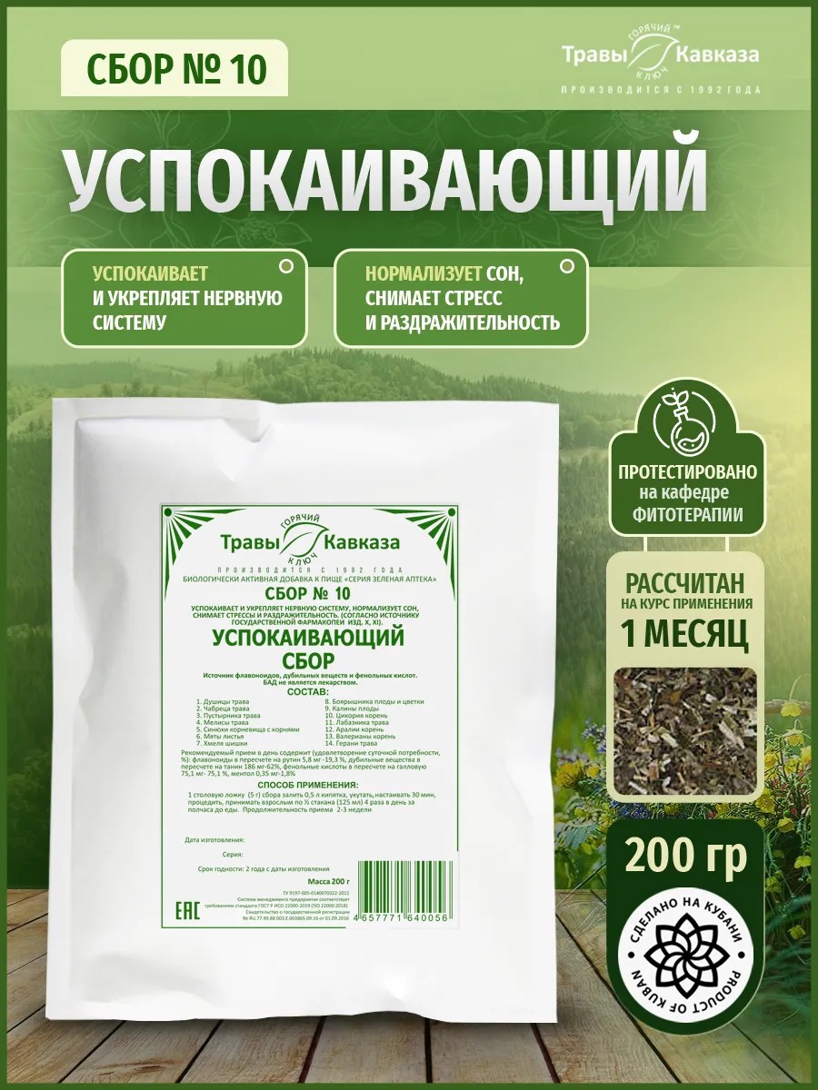 Сбор № 10 предназначен для успокоения и укрепления нервной системы. Он помогает нормализовать сон, снять стресс и раздражительность, а также поддерживает общее эмоциональное состояние.