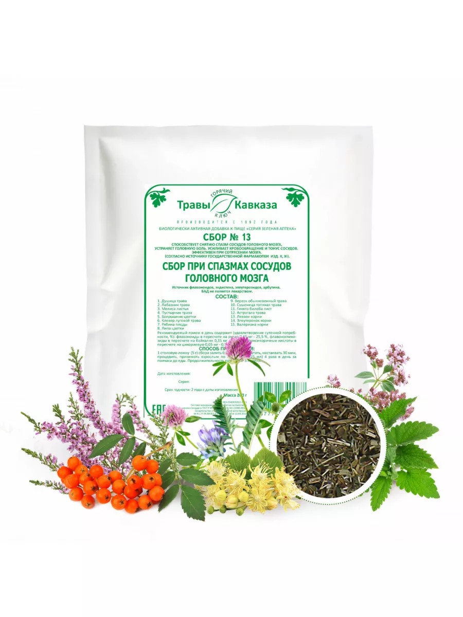 Herbal collection #13 for spasms of cerebral vessels from "Herbs of the Caucasus" - helps relieve spasms of cerebral vessels, eliminates headaches.