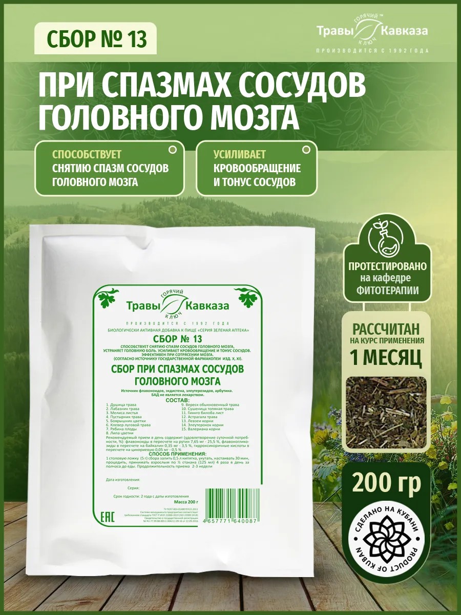 Сбор № 13 разработан для снятия спазмов сосудов головного мозга и устранения головной боли. Он способствует улучшению кровообращения и повышению тонуса сосудов, а также может быть полезен при сотрясении мозга. Сбор оказывает успокаивающее действие и помогает нормализовать сон.