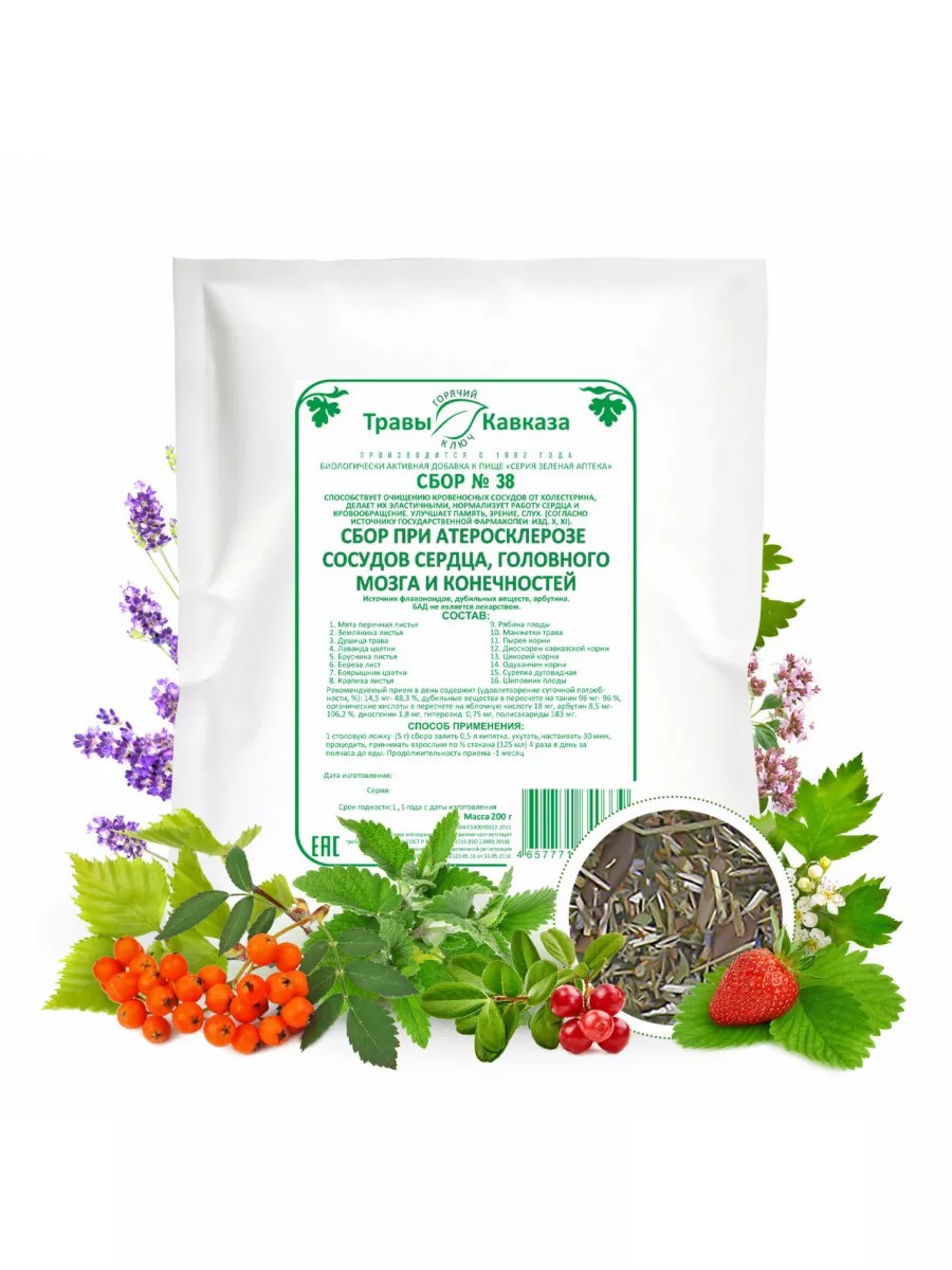 Травяной сбор № 38 от «Травы Кавказа» способствует очищению кровеносных сосудов от холестерина, делает их эластичными, нормализует работу сердца и кровообращение.