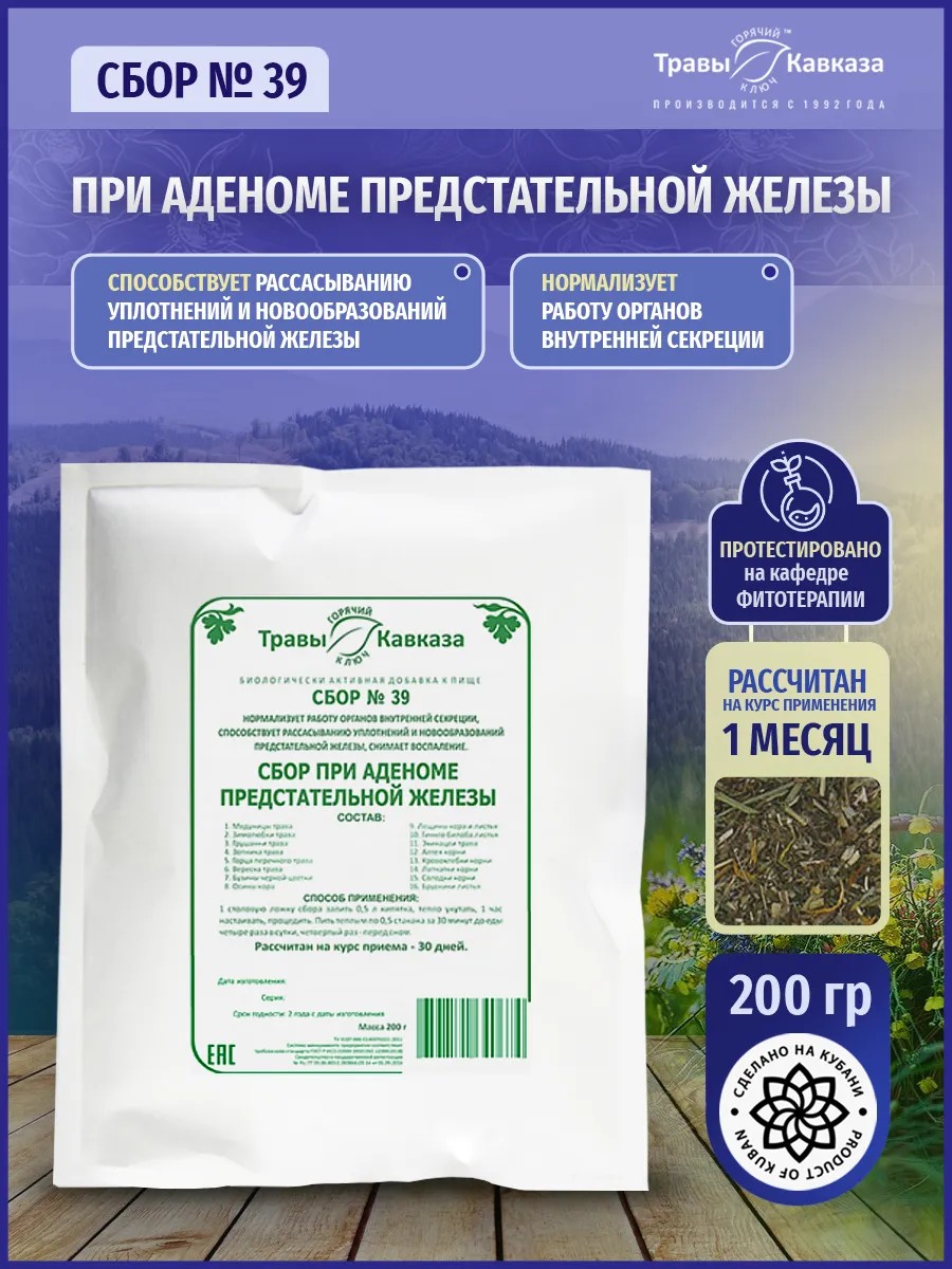 Сбор №39 обладает уникальными свойствами, направленными на нормализацию работы предстательной железы и улучшение состояния мочеполовой системы. Его компоненты способствуют рассасыванию уплотнений и новообразований, снимают воспаление, обладают противоопухолевыми и противовоспалительными эффектами. В составе сбора — травы, известные своими лечебными свойствами для предстательной железы, такие как грушанка, зимолюбка и бузина, которые снимают воспаление и оказывают благотворное влияние на весь мочеполовой тракт. Кора осины, кора лещины и кровохлебка обладают антивирусной и противоинфекционной активностью, что способствует улучшению общего состояния. Эхинацея укрепляет иммунитет, а гинкго билоба улучшает кровообращение и оказывает мочегонный эффект.