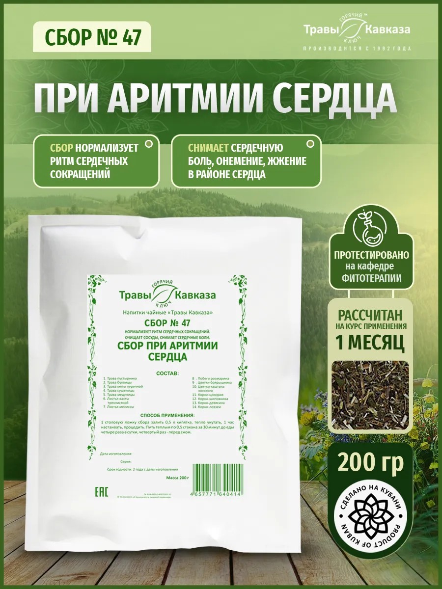 Сбор № 47 предназначен для нормализации ритма сердечных сокращений и улучшения состояния сердечно-сосудистой системы.