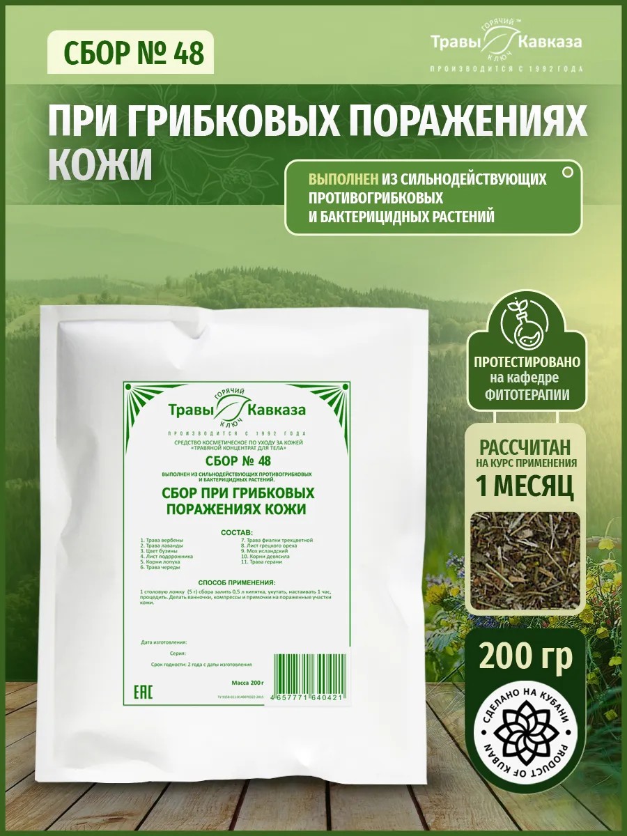 Сбор № 48 создан на основе мощных противогрибковых и бактерицидных растений, обладающих противовоспалительными свойствами. Он включает травы, которые безопасны для организма и эффективны при наружном применении для лечения различных кожных заболеваний. Сбор можно использовать для приготовления ванн, компрессов, ванночек и примочек.