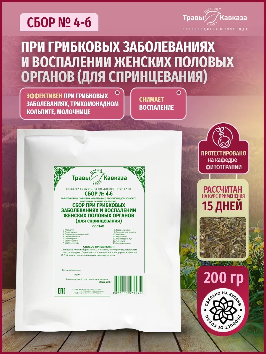 Сбор № 4-б предназначен для эффективного лечения грибковых заболеваний, таких как трихомонадный кольпит и молочница. Он помогает снять воспаление и борется с грибковыми инфекциями, часто поражающими нижние отделы женских половых органов, в частности кандидоз. В состав сбора входят травы, корни и кора, которые обладают антимикробными свойствами и способствуют устранению воспалительных процессов. Следует учитывать, что трихомонадный кольпит может передаваться половым путем, поэтому важно проводить лечение совместно с партнером.