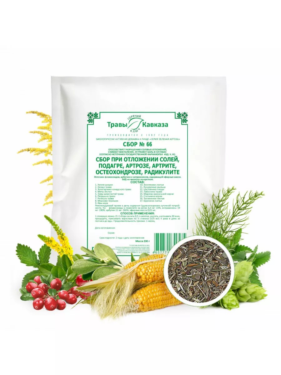 Травяной сбор №66 от «Травы Кавказа» - разрушает солевые отложения, снимает воспаление, устраняет боль в суставах, регулирует водно-солевого баланс в организме