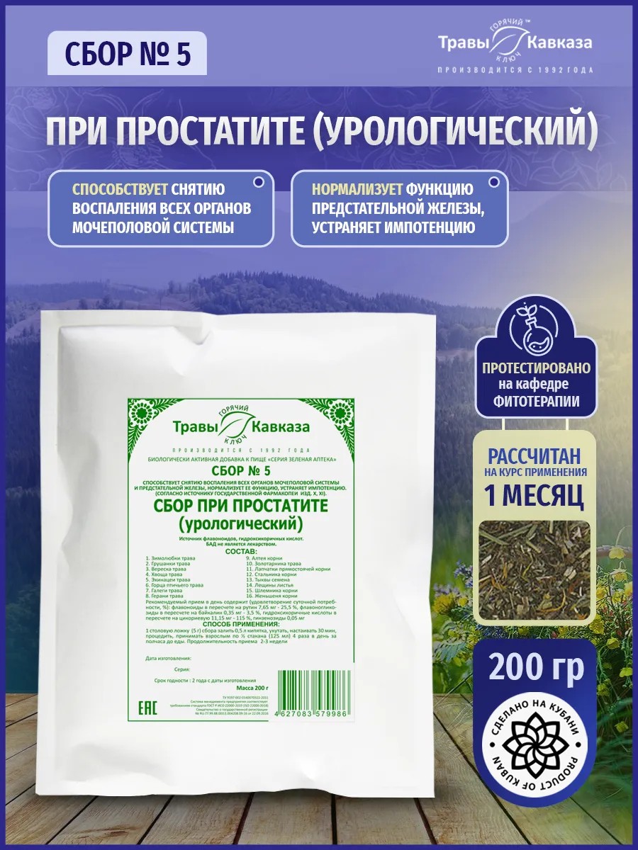 5 for prostatitis (urological) helps relieve inflammation of all organs of the genitourinary system and the prostate gland, normalizes its function, and eliminates impotence.