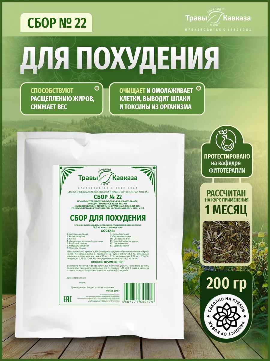| Торговое наименование | биологически активная добавка к пище "Cерия Зеленая Аптека "СБОР №22" (пачки, пакеты от 30 до 500 г, фильтр-пакеты по 1,5 - 2,5 г) |