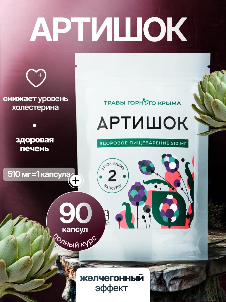 Экстракт артишока оказывает желчегонное, гепатопротекторное, мочегонное действие. Используется в качестве мощного пробиотика, снижает холестерин, а также помогает кишечнику восстановить баланс микрофлоры. Результаты от курса приема: стабилизация работы желчного пузыря; нормализация оттока желчи; поддержка естественной защиты клеток печени; выведение из печени и почек токсинов и соединений тяжёлых металлов; улучшение холестеринового обмена; отвод лишней жидкости из организма; снижение потовыделения, уменьшение неприятного запаха; нормализация содержания микроэлементов в организме; сокращение воспалительных процессов в слизистой кишечника и желудка; улучшение состояния печени. Каждая такая желчегонная капсула максимально эффективно и целенаправленно доставляет биологически активные вещества растений к клеткам организма, обеспечивая ежедневное микропитание, необходимое для поддержания здоровья всех жизненно важных органов и систем. Натуральный препарат для печени выводит токсины и чистит организм. Удобная формула для приема подойдет мужчинам и женщинам, следящим за своим здоровьем. Природное средство нормализует уровень микрофлоры в кишечнике, улучшает работу желудка и желчного пузыря, ускоряет отток желчи. Артишок эффективен для выведения токсинов, защиты клеток печени, имеет желчегонное, гепатопротекторное, мочегонное действие. Оказывает детокс-эффект. Растительный препарат экстракт артишока в капсулах выводит лишнюю жидкость, уменьшает отеки. Регулярный прием положительно сказывается на работе ЖКТ, общем самочувствии, иммунитете. Природная формула обладает накопительным эффектом, курс приема рассчитан на 2 месяца. В отличие от быстродействующих лекарств, травяные таблетки действуют мягко, не вызывая дискомфорта и побочных действий. Подходят вегетарианцам и приверженцам правильного питания. Способ применения: по 2 капсуле 2 раза в день. Рекомендуем хранить в сухом темном месте с товарами бакалеи и продуктами питания. Противопоказания: индивидуальная непереносимость компонентов, беременность, кормление грудью. Перед применением рекомендуется проконсультироваться с врачом. Продукция торговой марки "Травы Горного Крыма" производится в экологически чистом горном районе, у подножия горы Ай-Петри уже более 10 лет. Продукция сертифицирована в соответствии требованиям технических регламентов Евразийского экономического союза.