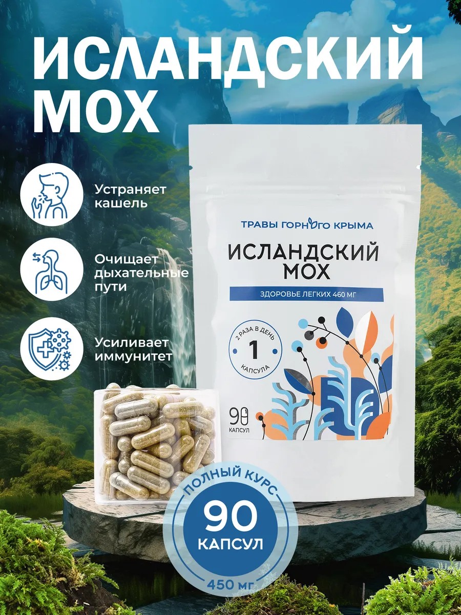 Исландский мох (цетрария исландская) - это природное мощное средство, обладающее сильнейшими противомикробными свойствами. Повышает и укрепляет естественные защитные функции организма, защищает от вирусных и простудных заболеваниях, устраняет кашель, укрепляет иммунитет. Прекрасно разжижает и выводит мокроту из легких, облегчает дыхание, избавляет от кашля. Природное средство эффективно для лечения болезней легких и бронхов, постковидных симптомов. Натуральный препарат применяется при простуде, гриппе, коклюше, пневмонии, туберкулезе. Также экстракт исландского моха полезен при заболеваниях ЖКТ, аллергии, нарушениях обмена веществ. Природная формула обладает накопительным эффектом, курс приема рассчитан на 2 месяца. В отличие от быстродействующих лекарств, травяные таблетки действуют мягко, не вызывая дискомфорта и побочных действий. Подходят вегетарианцам и приверженцам правильного питания, подходит взрослым и детям. Способ применения: по 1 капсуле 2 раза в день. Рекомендуем хранить в сухом темном месте с товарами бакалеи и продуктами питания. Противопоказания: индивидуальная непереносимость компонентов, беременность, кормление грудью. Перед применением рекомендуется проконсультироваться с врачом. Продукция торговой марки "Травы Горного Крыма" производится в экологически чистом горном районе, у подножия горы Ай-Петри уже более 10 лет. Продукция сертифицирована в соответствии требованиям технических регламентов Евразийского экономического союза.